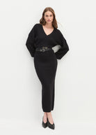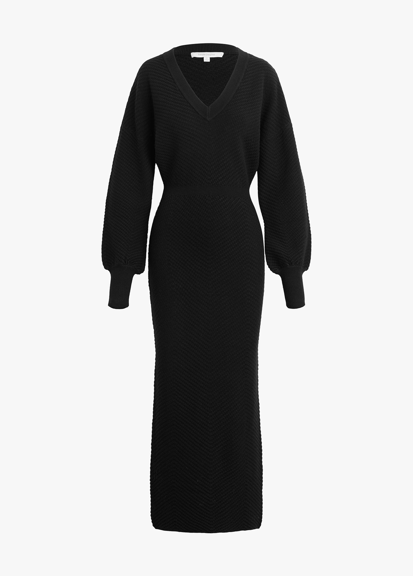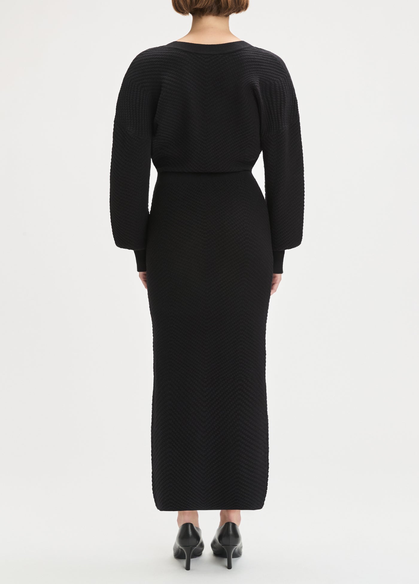 Comfort got dressed up. In soft chevron knit with a flattering V-neckline, blouson waist, and subtle sleeve drama, The Ava Dress hugs from the hips down in a 50" midi length.