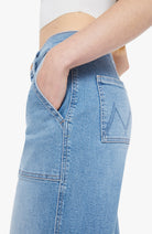 Full throttle. Super high-waisted jeans with a loose fit, wide leg, zip fly, patch pockets and a 28.25-inch inseam with a clean hem. Made from a blend of recycled stretch denim, Ride Hard Live Louder is a light blue with subtle whiskering and fading at the knees.