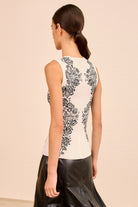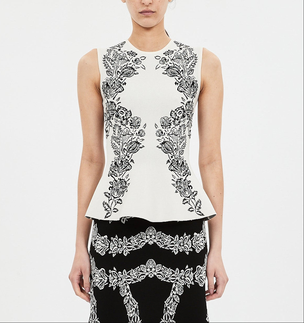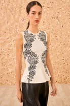 Artfully knitted from stretch jacquard, the Vanna Tank features vine motifs richly spun in graphic symmetry. This white and black top is softly structured with a peplum hem for timeless refinement.