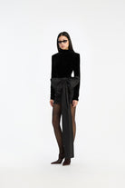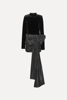 VELVET BOW MINI DRESS BLACK IS A FITTED MINI DRESS WITH LONG SLEEVES AND A HIGH NECKLINE. THE UPPER PART IS CRAFTED IN A SOFT VELVET MATERIAL, WHILE THE SKIRT IS RUCHED ALONG THE SIDES AND BACK. IT FEATURES A LARGE, SCULPTURAL BOW WITH AN EXTENDED DRAPED PANEL. THE DRESS IS LINED.