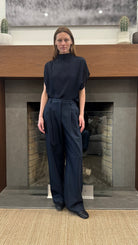 Mock neck, cap sleeved blouse draped in medium weight silk stretch georgette. Wish you would top a loose fit, with a soft drape that skims the body. Complete with a placket trim on one shoulder and pleats on the other shoulder.
