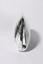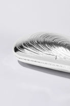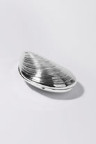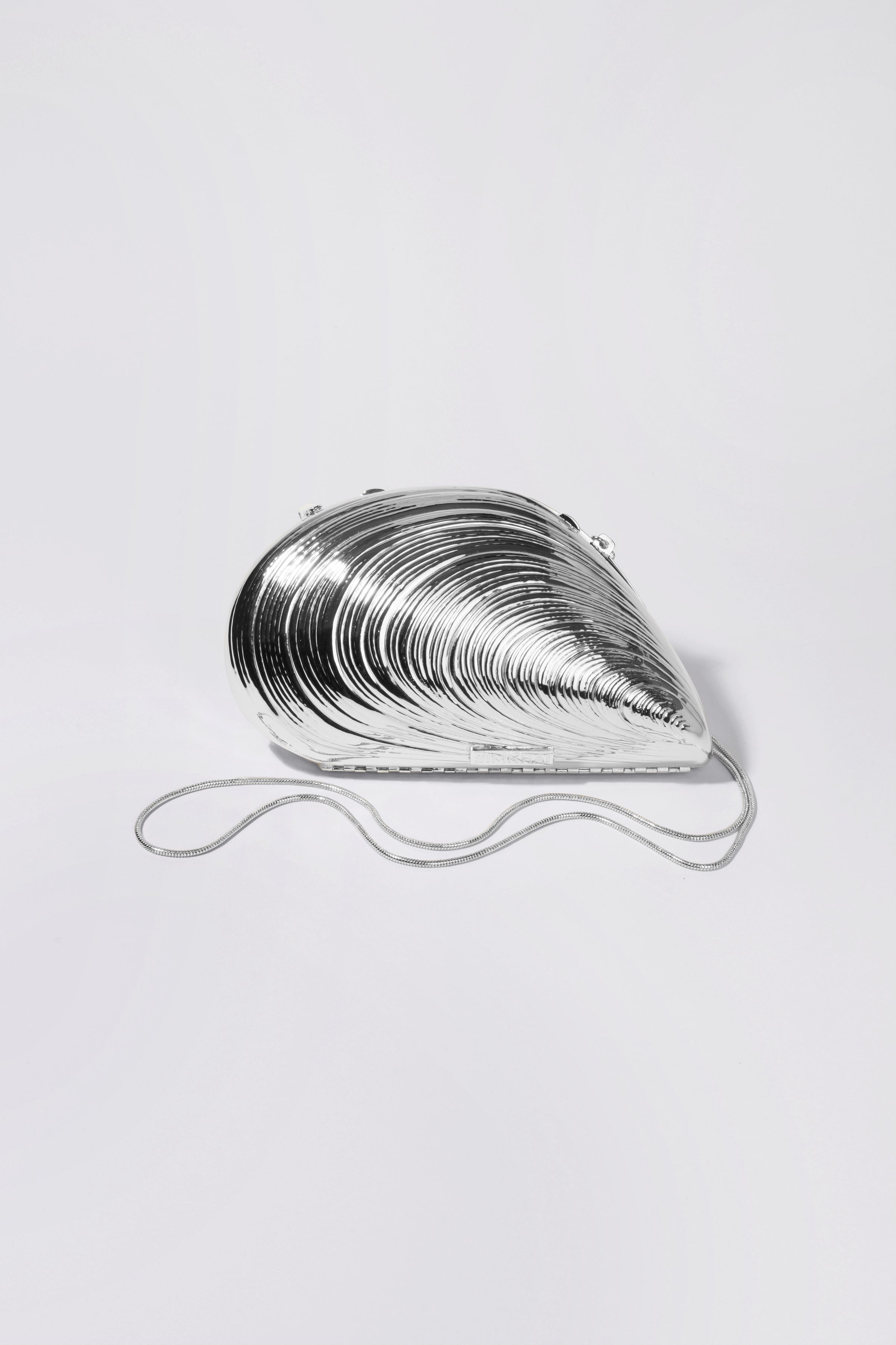 The Bridget Metal Shell Clutch in Silver. Cast from metal and designed as a hardshell clamshell case elegantly shaped like an oyster. Tonal satin lined interior, and chain shoulder strap.