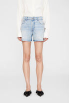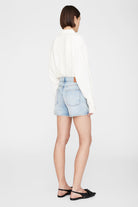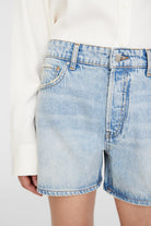 The Dalton Short is constructed from midweight 100% regenerative cotton denim without stretch in a washed-out blue with destruction. Its high-waisted silhouette is intended to be worn low on the hips for an ultra-relaxed look.