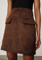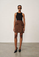 Introducing the Benjamin Skirt: A skirt with an A-line silhouette, featuring side panels and two front flap pockets.