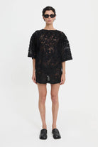The Delmare Mini Dress in black explores texture and proportion with quiet intensity. Cut in a relaxed, elongated silhouette, it moves freely through the body, allowing the fabric to lead. Crafted from intricate lace, the sheer finish creates depth and dimension, while the short sleeves and clean neckline keep the form restrained and intentional.