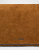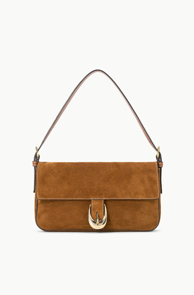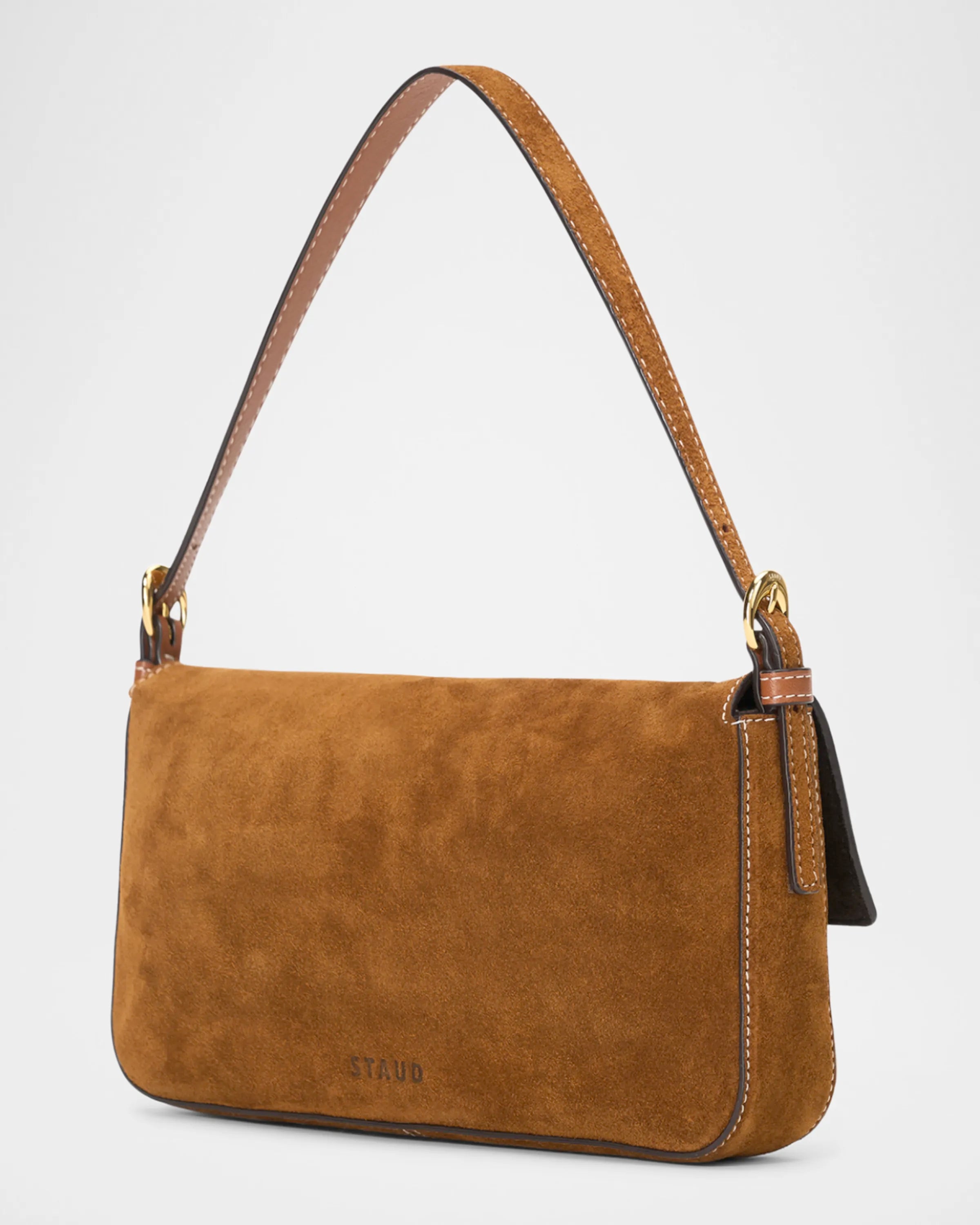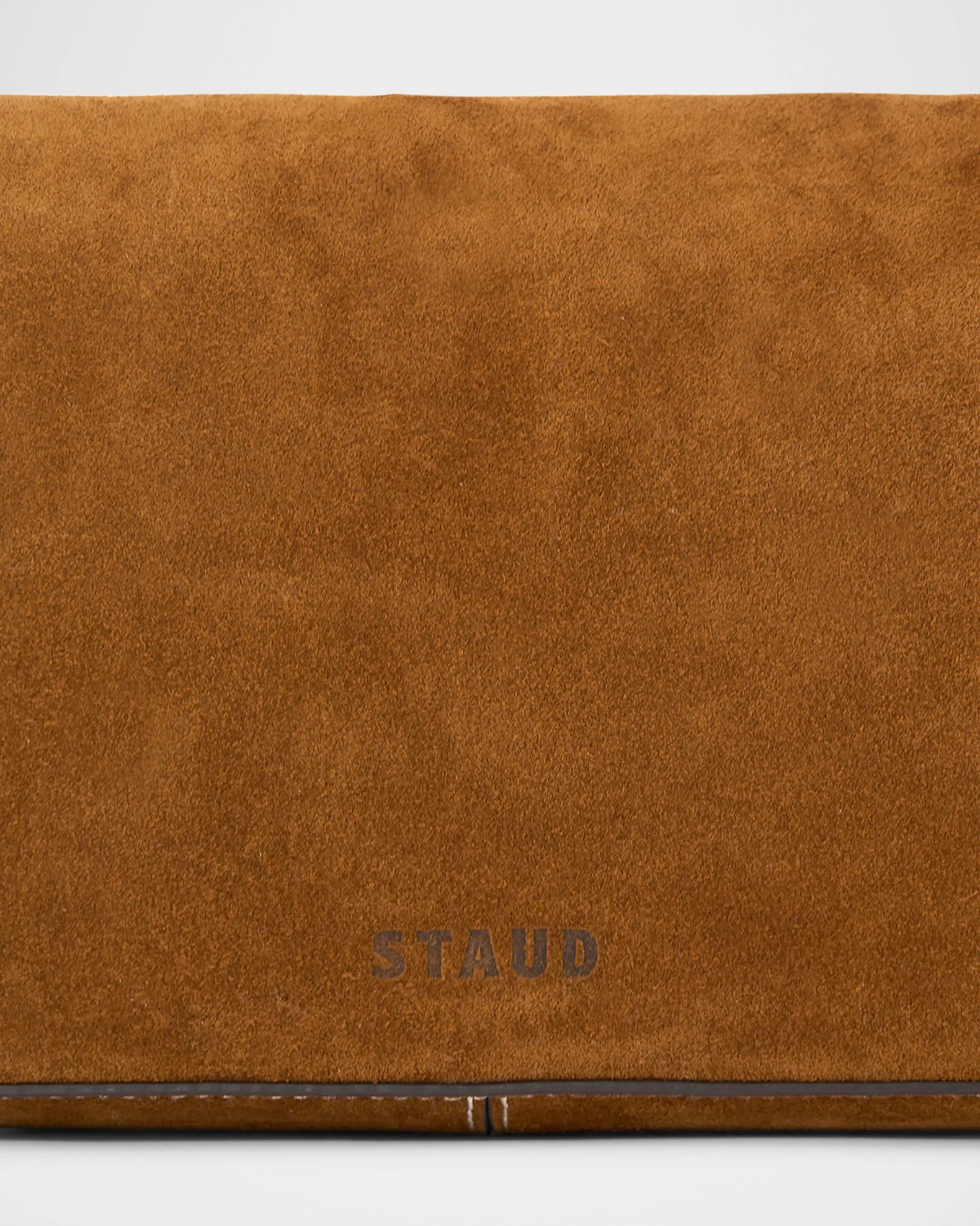 STAUD "Harlow" buckle suede shoulder bag in Hazel