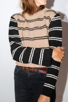 Stay cozy and stylish in this slightly cropped sweater featuring soft fuzzy detailing and a charming mix stripe pattern. Its comfortable fit and unique texture add warmth and personality to your everyday look. Perfect for layering or wearing on its own, this sweater brings a touch of playful elegance to any outfit.