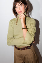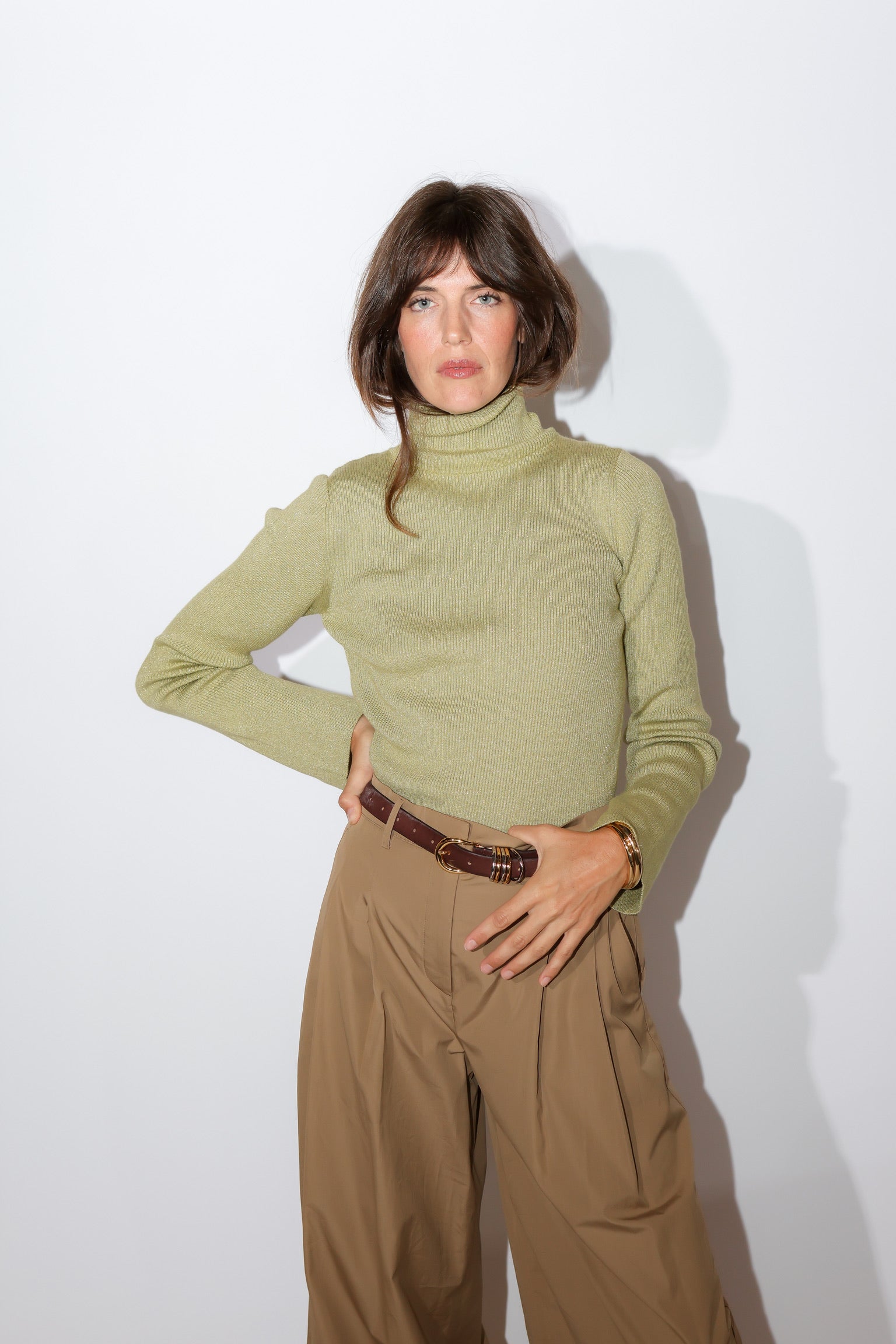 This metallic rib turtleneck sweater features a subtle sparkle throughout, adding just the right amount of shine to your look. Designed with splits at the sleeves, it brings a modern twist to classic style. Perfectly paired with high-waisted trousers, it combines comfort and elegance for a polished, confident outfit.