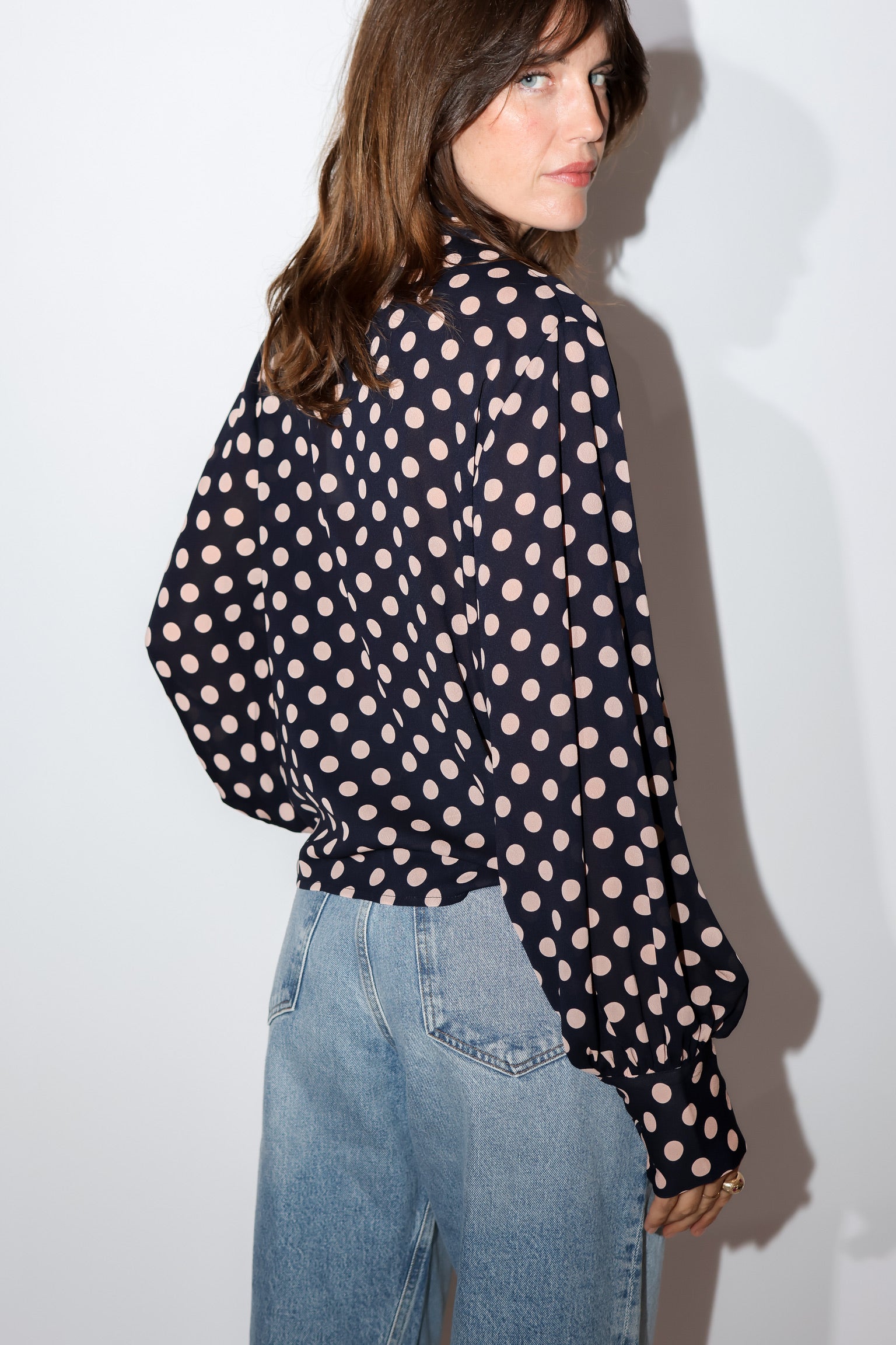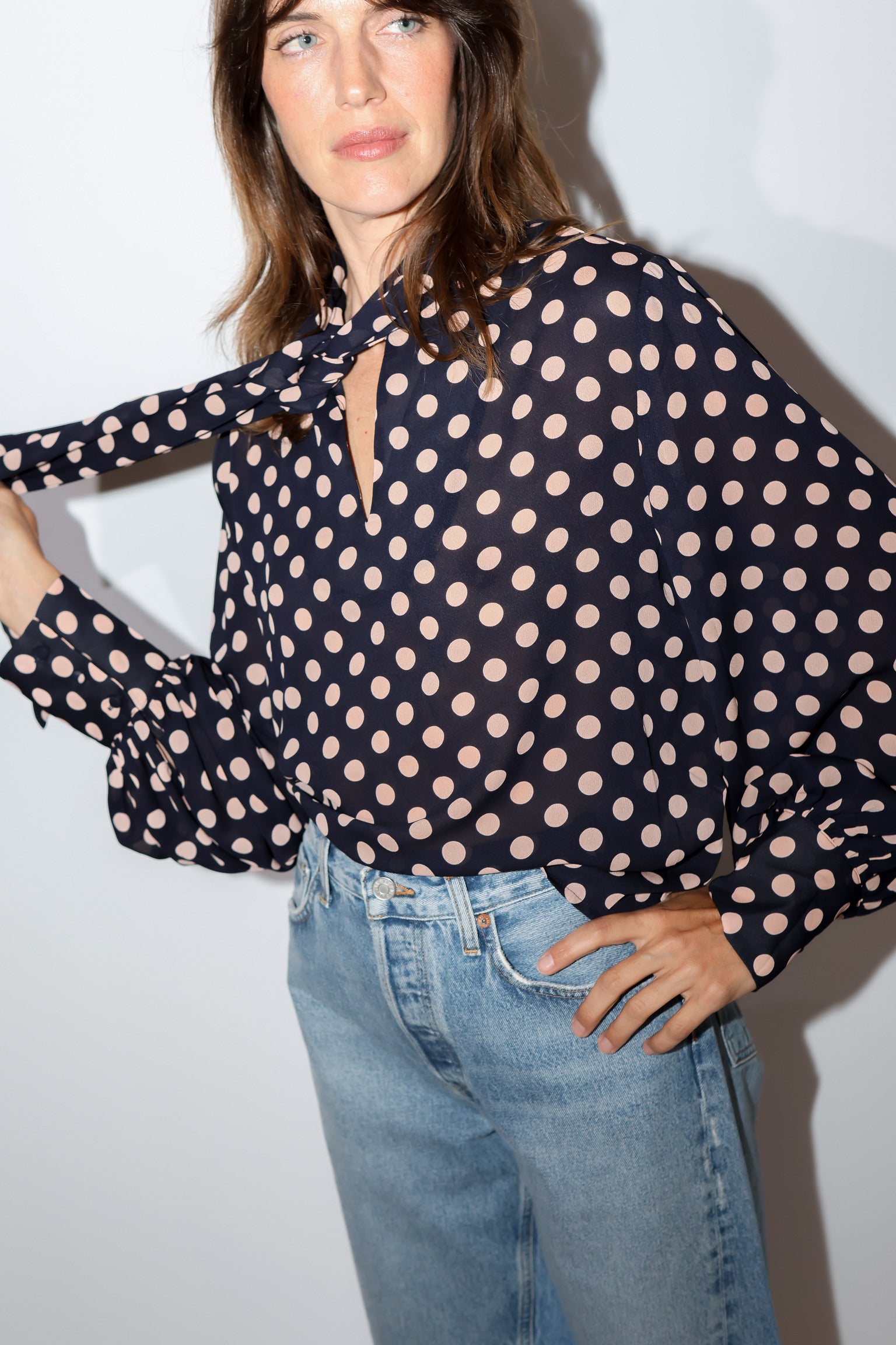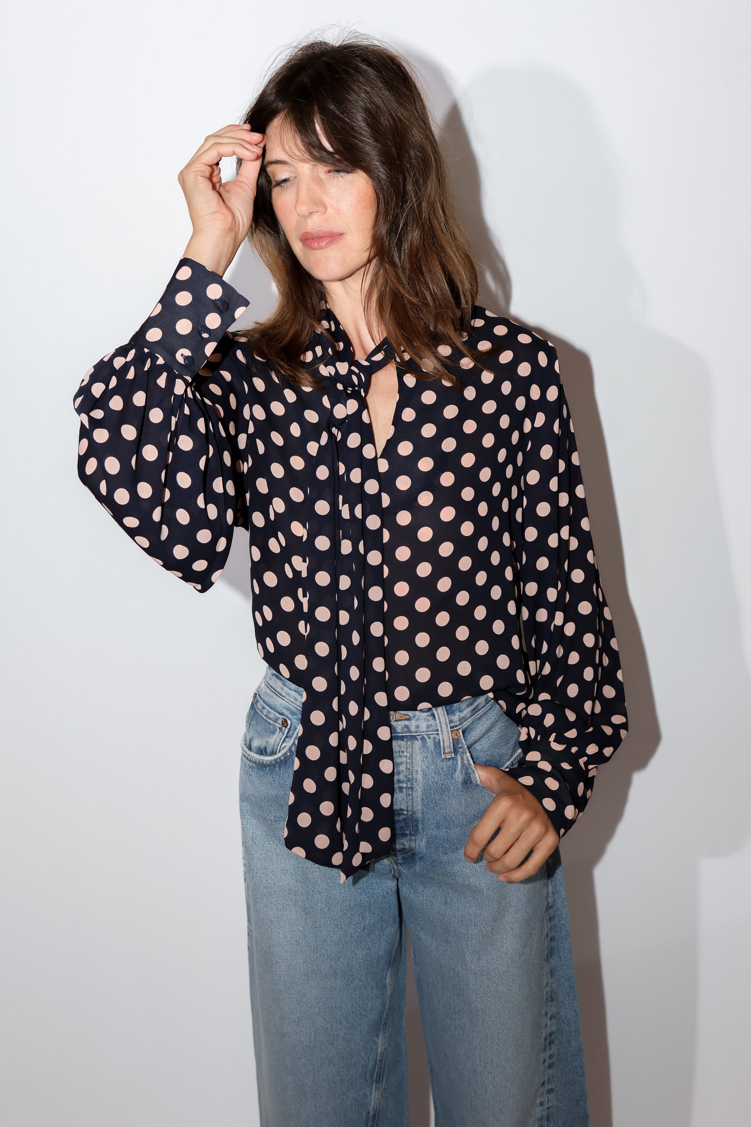 This semi-sheer polka dot blouse features a voluminous silhouette and a delicate tie at the neck, offering both style and versatility. Tuck it in to create a flattering blouson effect that adds shape and dimension to your outfit. Perfect for layering or wearing on its own, this top brings a playful yet elegant touch to your wardrobe.