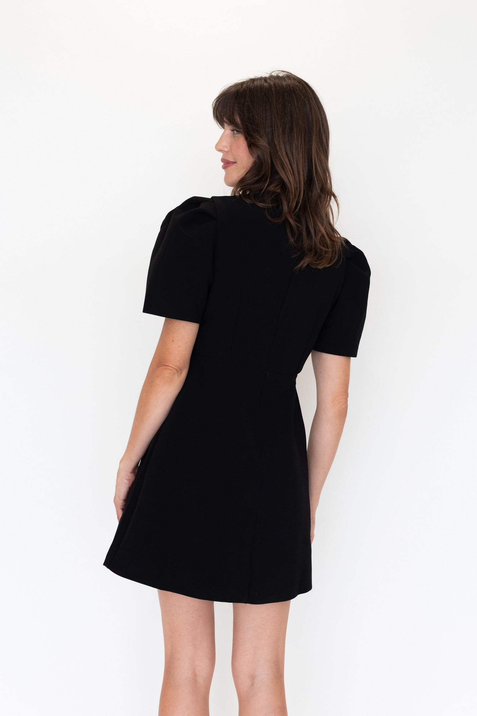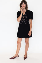This mini dress features a charming bow detail accented with delicate mini studs, adding a subtle edge to its feminine silhouette. Perfect for pairing with tights and kitten heels, it offers a stylish yet comfortable look ideal for both day and evening occasions. Embrace effortless elegance with this versatile dress.