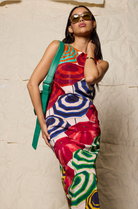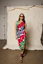 Showcasing a sleeveless, high-neck silhouette, the Riviera Electra Dress has a clean and elegant neckline, set with a Classic Muma Print; hand illustrated and handplaced by our designers. Large abstractions of Coastal Umbrellas from the perspective of the hotel room sweep diagonally around the bias-cut silhouette to create a seasonal feature piece that flatters any figure. With a sleek, form-fitting cut, it's both a flattering & stylish option for resort wear or evening events.