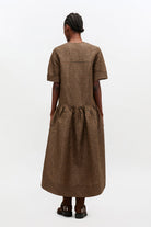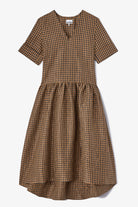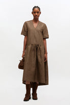 This dress features a V-neckline, short sleeves and a drop-waist design.