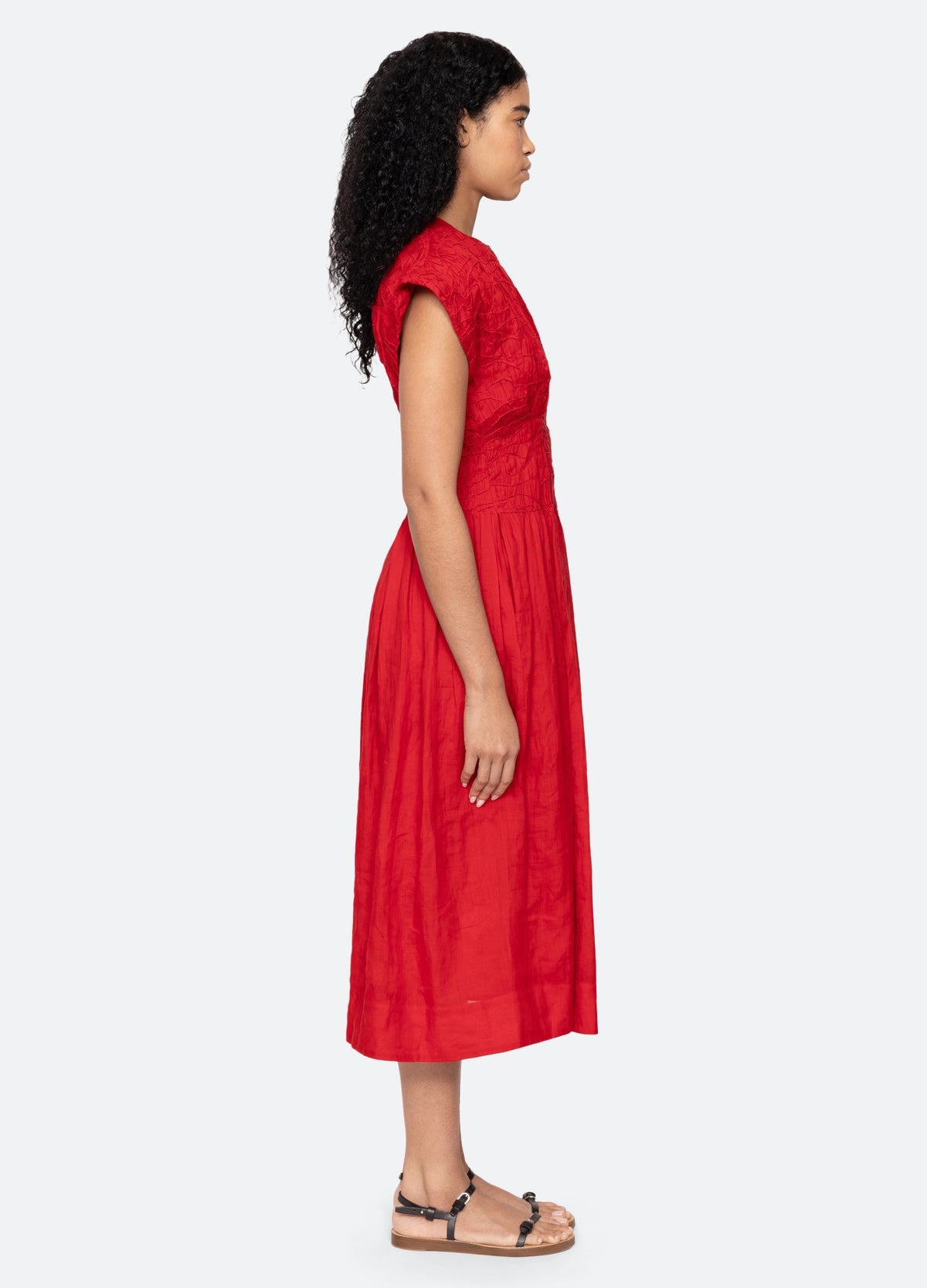 The Imogen dress features a timeless midi silhouette with intricate pintuck detailing. Short sleeves add a touch of ease to its refined, feminine design.