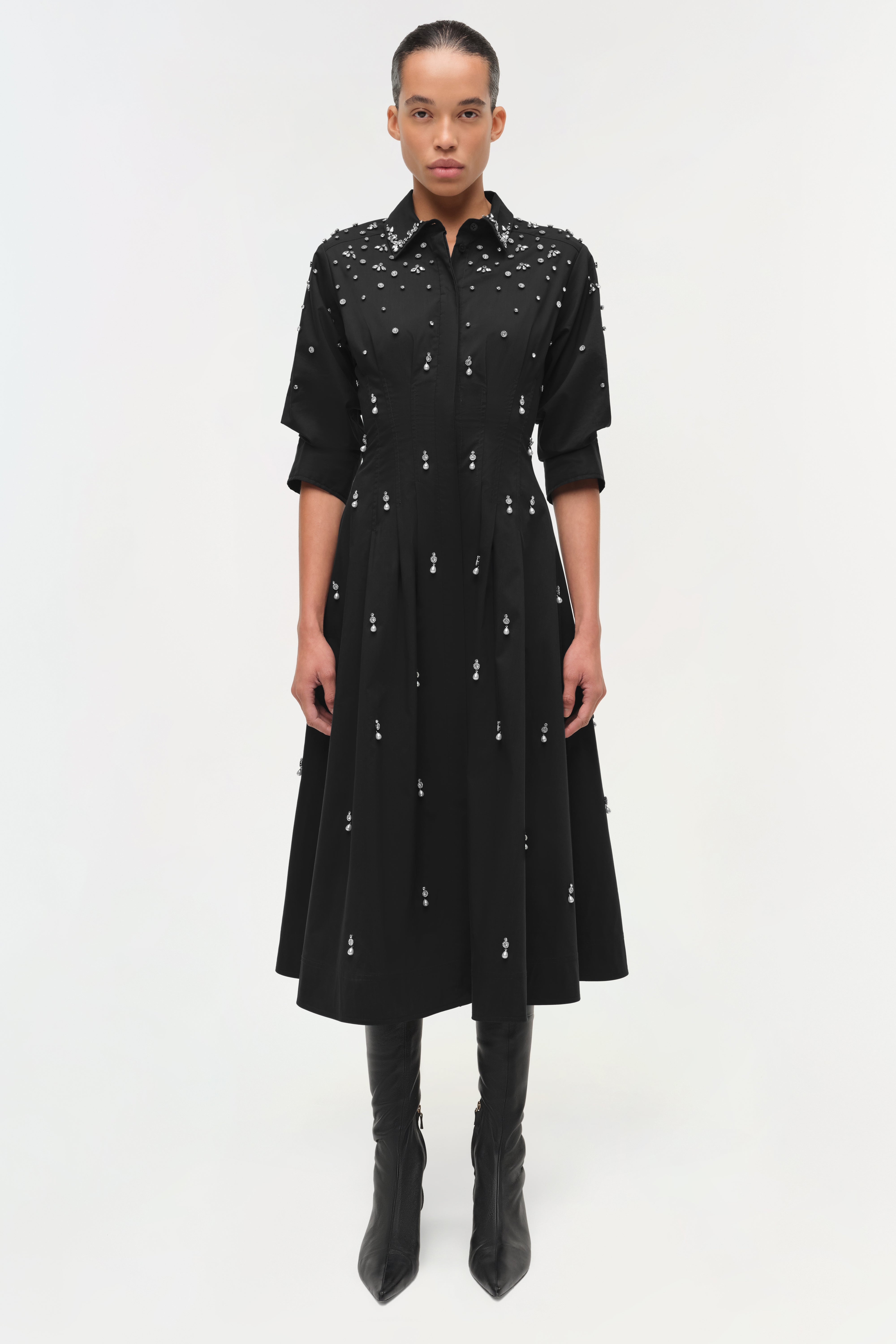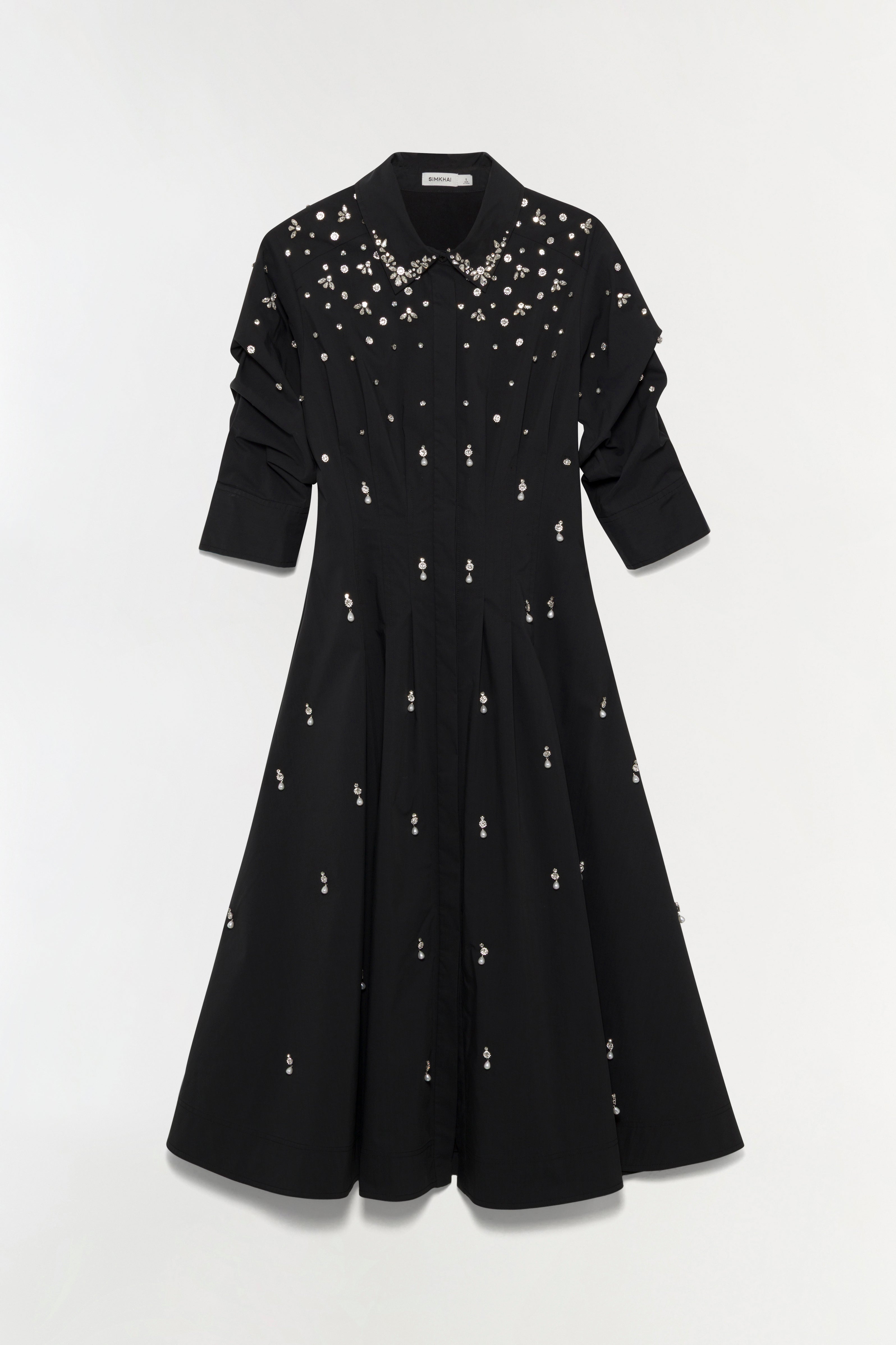 A pin tuck midi dress cut from cotton poplin that gathers at the waist to flatter the figure before falling into a graceful A-line skirt. Hand-sewn crystal and pearl embellishments scatter across the silhouette, adding texture and detail. A pointed collar and structured sleeves balance the ornamentation with a sense of modern refinement.