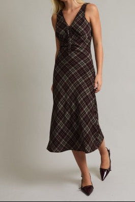 Effortlessly elegant, this sleeveless midi dress features a timeless burgundy-taupe check pattern that transitions beautifully from day to evening. Delicate lace trim adds a touch of refined femininity to the neckline and hem, while the bias cut flatters your silhouette with graceful movement. Perfect for those moments when you want to feel polished and put-together without compromising on comfort. A versatile wardrobe essential that celebrates your individual style.