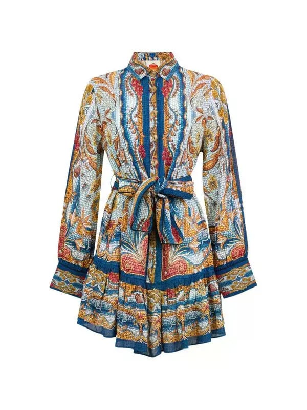 Step into vibrant charm with the Blue Mosaic Garden Belted Mini Dress from FARM Rio. Featuring a playful mosaic-inspired print in soothing blues and crisp whites, its relaxed silhouette flows effortlessly, cinched at the waist with a self-tie belt for a flattering shape. The crisp collar neckline adds a touch of structure, while the breezy fabric invites movement and warmth. This dress captures carefree spirit and garden-fresh joy in every stitch.