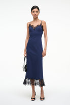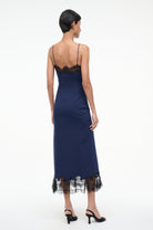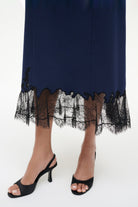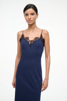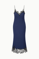 The Nadia Dress is a fitted silhouette with contrast lace detailing at the neckline and hem. This style features princess seaming and thin spaghetti straps.