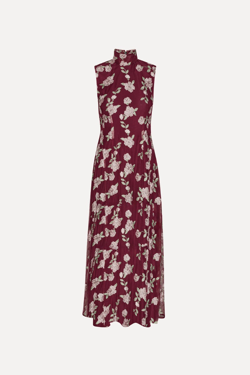SLEEVELESS MAXI DRESS BORDEAUX FLOWER PRINT IS A LONG DRESS WITH A HIGH NECKLINE AND A FITTED BODICE. THE FLARED SKIRT FLOWS FROM THE WAIST, CREATING AN ELONGATED SILHOUETTE. THE FLORAL EMBROIDERY ADDS TEXTURE AND CONTRAST TO THE SEMI-SHEER OVERLAY. CLOSED AT THE BACK, ENSURING A STRUCTURED FIT.