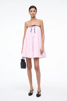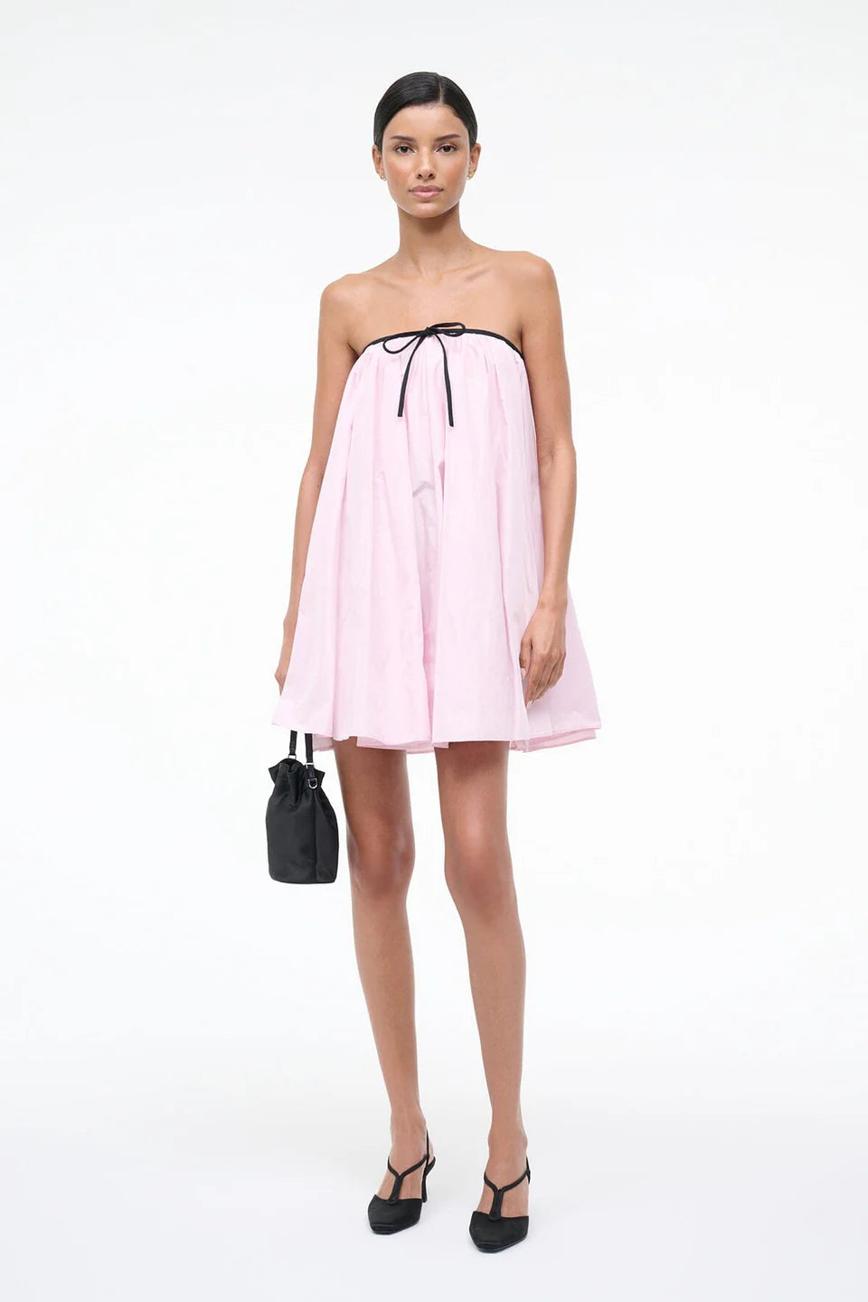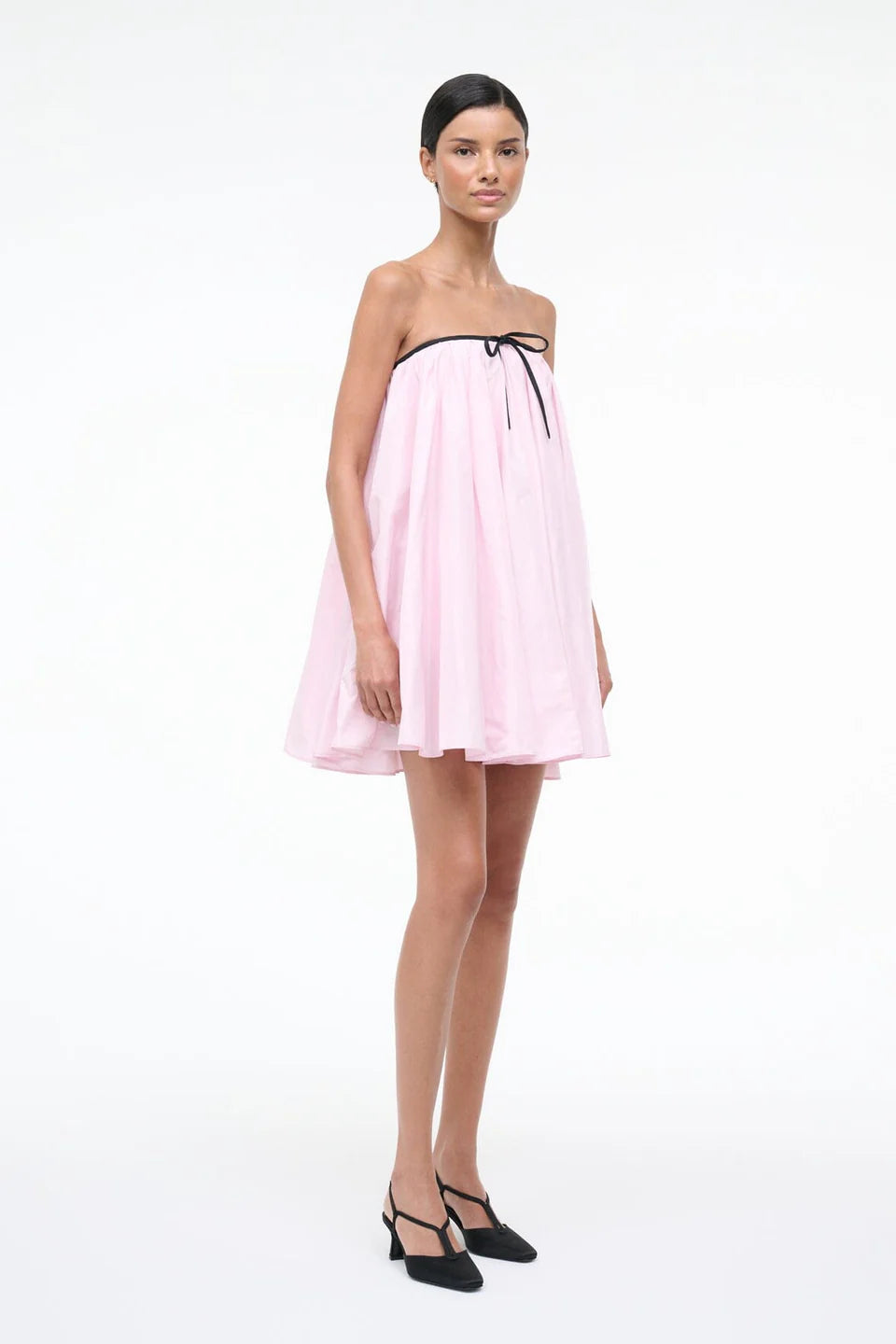 The Sofia Dress is a flirty cocktail mini dress crafted with a voluminous taffeta body with a bow detail at the top edge, pockets, and internal mesh corset for added support.