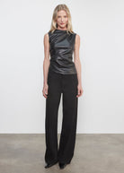 Sleeveless top in vegan leather with asymmetric ruche detail. High neckline and clean back seam.