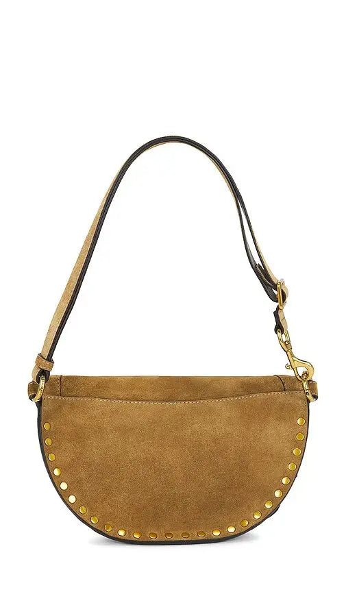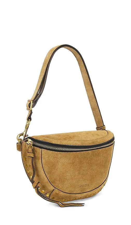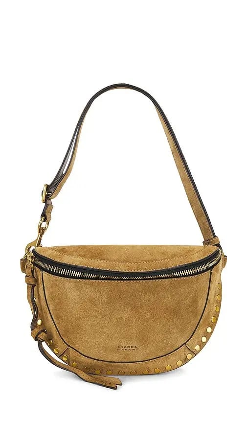 The Isabel Marant Skano fanny pack features a suede exterior with textile lining. It has a front zipper closure that opens to one main compartment with an interior leather card slot. The fanny pack has a back slip pocket and a detachable, adjustable waist strap. This belt bag measures approximately 11.5 W x 5.5 H x 1.5 D and is embellished with studs.