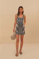 Embrace effortless style with the Off-White Monochrome Elegance Scarf Romper from FARM Rio. The Romper features a square neckline, button detailing, and a waist belt, and an intricate black and white botanical print that dances across the fabric. Each detail is crafted to evoke an artistic flair, creating a unique silhouette that feels both sophisticated and playful. Perfect for those who appreciate the subtle charm of monochrome designs