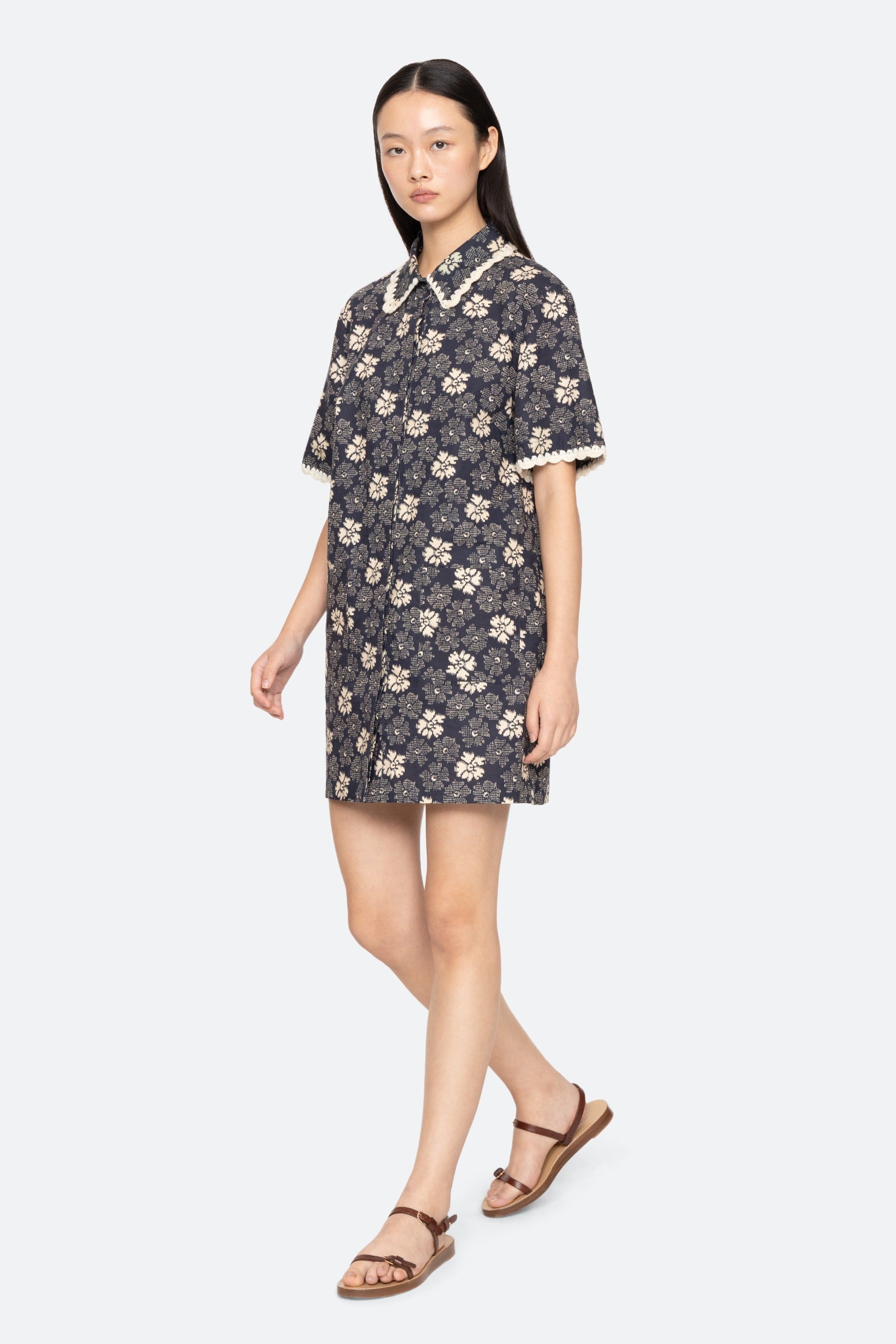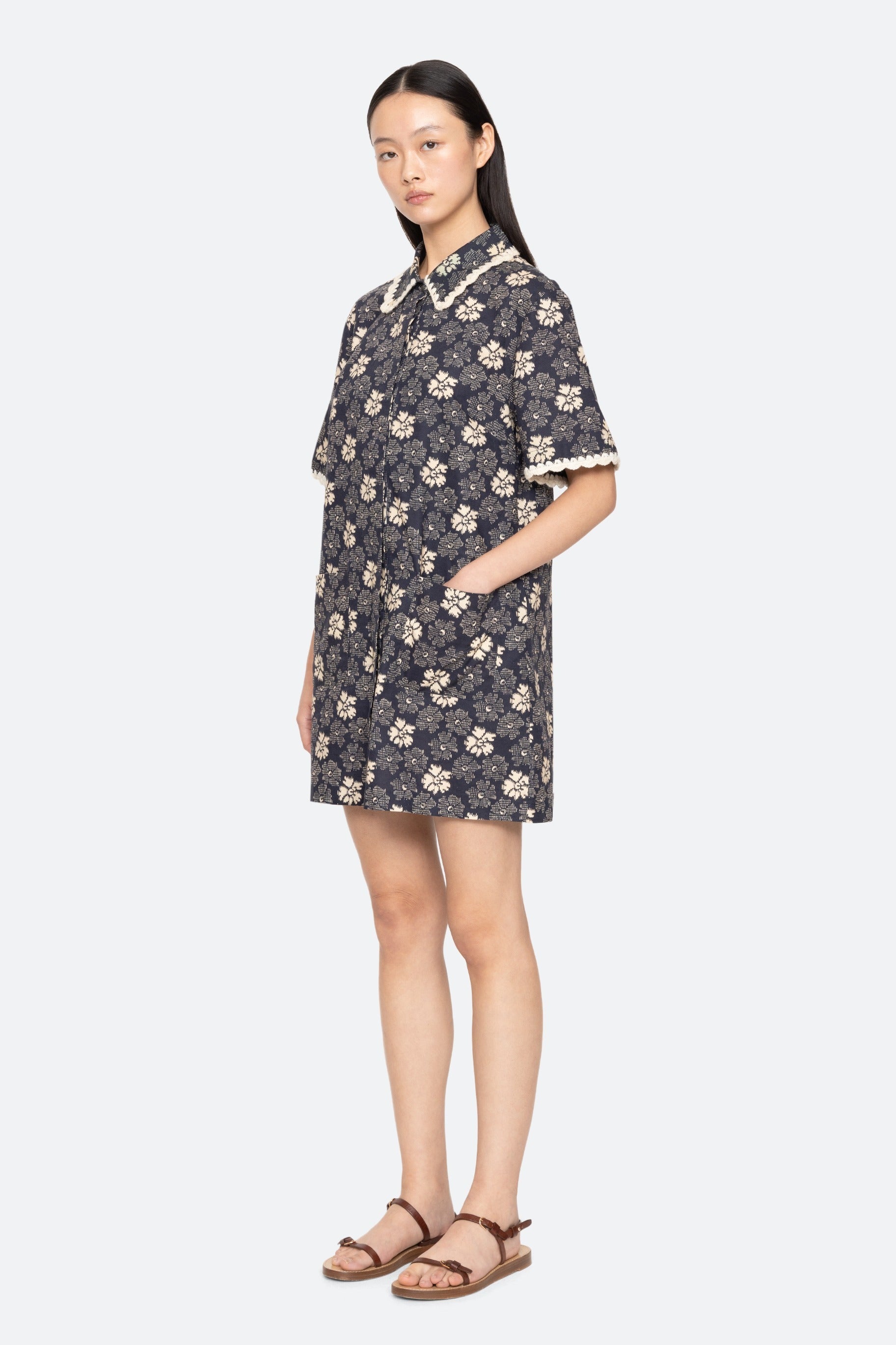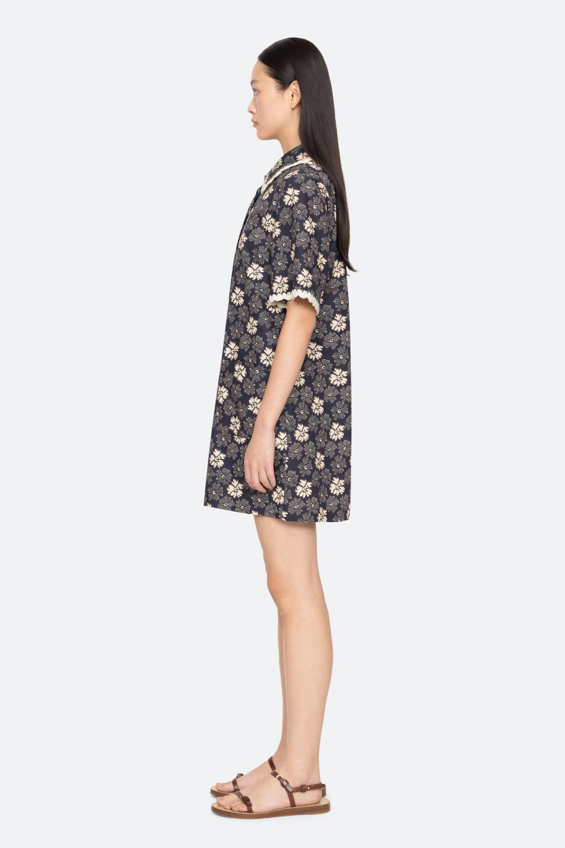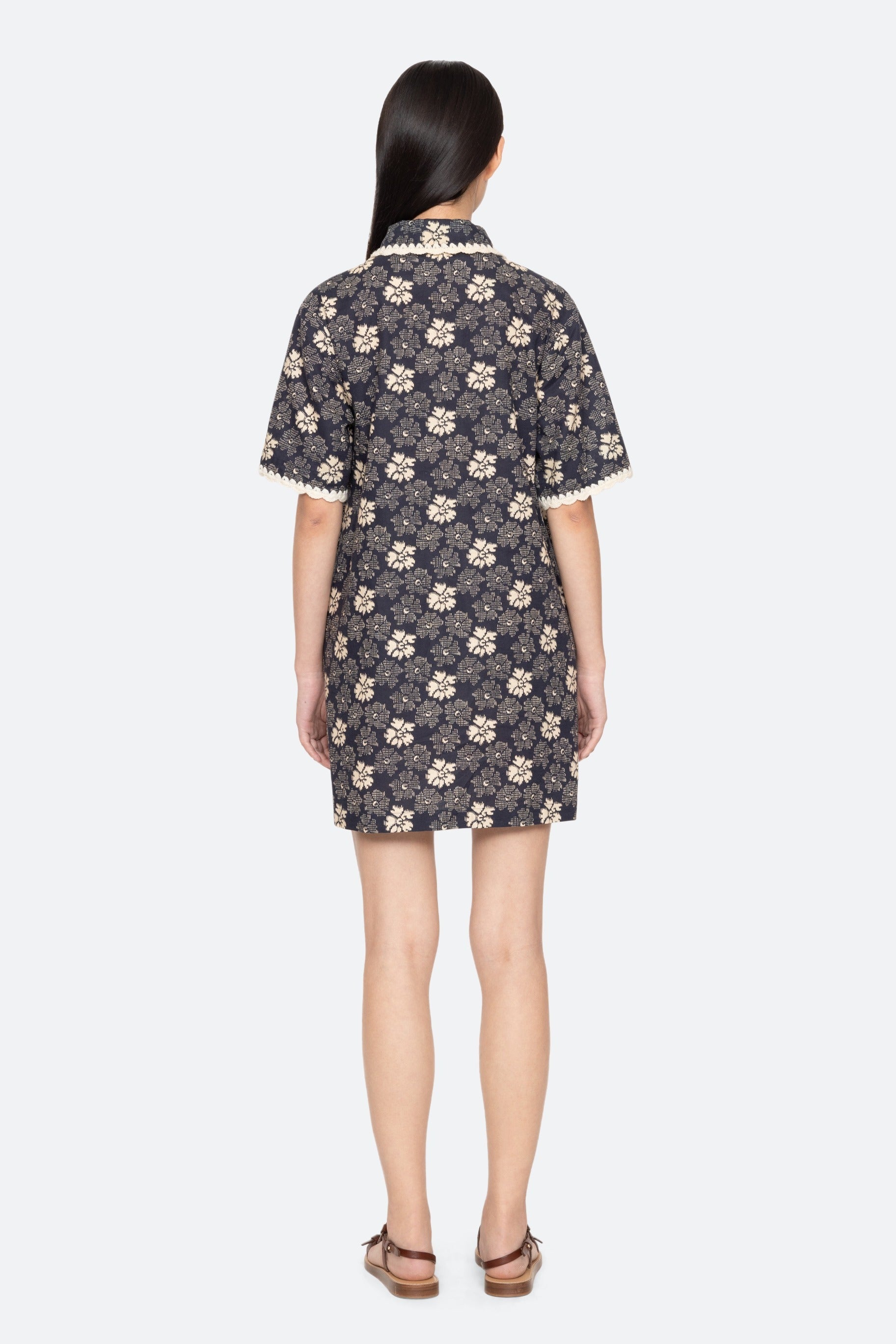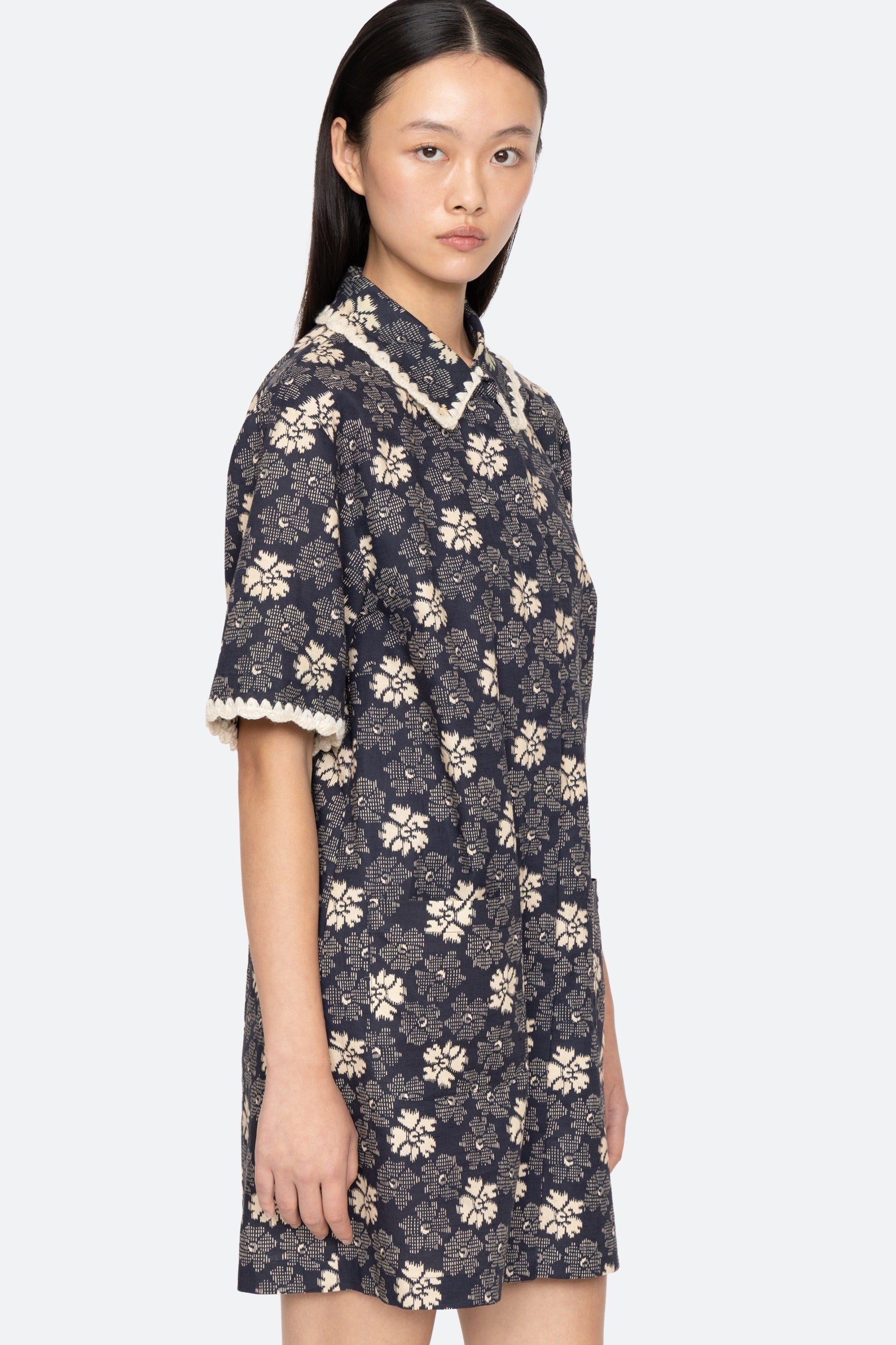 The Gloria floral-print coverup features a shirt-style design in a flattering mini silhouette, accented with hand-crocheted trim. An all-over floral print add a playful, colorful touch perfect for spring swimwear.