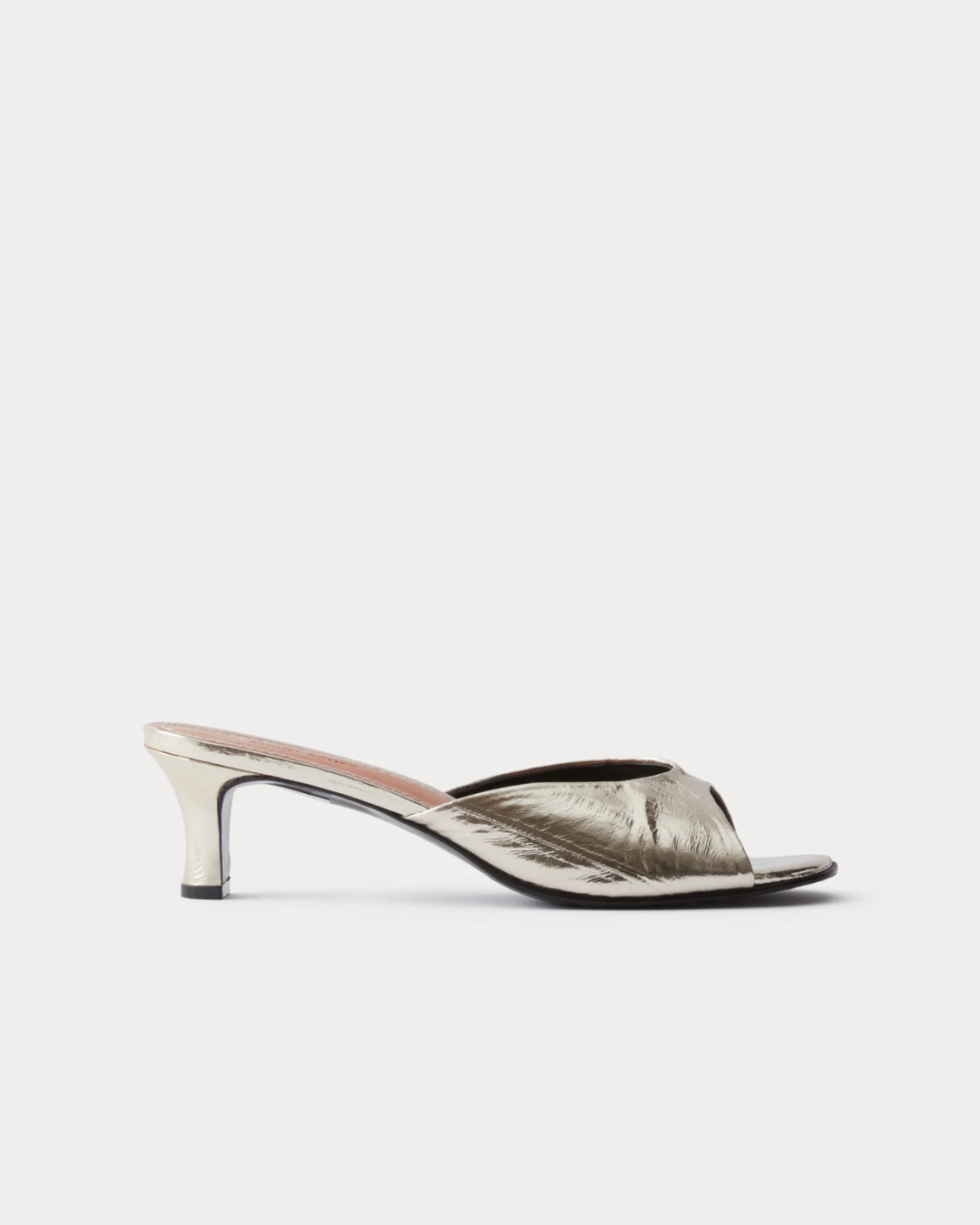 Classic kitten heel mule crafted from seamed eel leather with a naturally glossy texture. Features a metallic gold finish, a square toe, and padded insoles for added comfort.