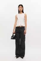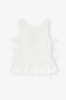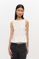 This white Smock Tie String Top is sleeveless and features a round neckline, smock bodice, tie details on the side and a ruffle detail.