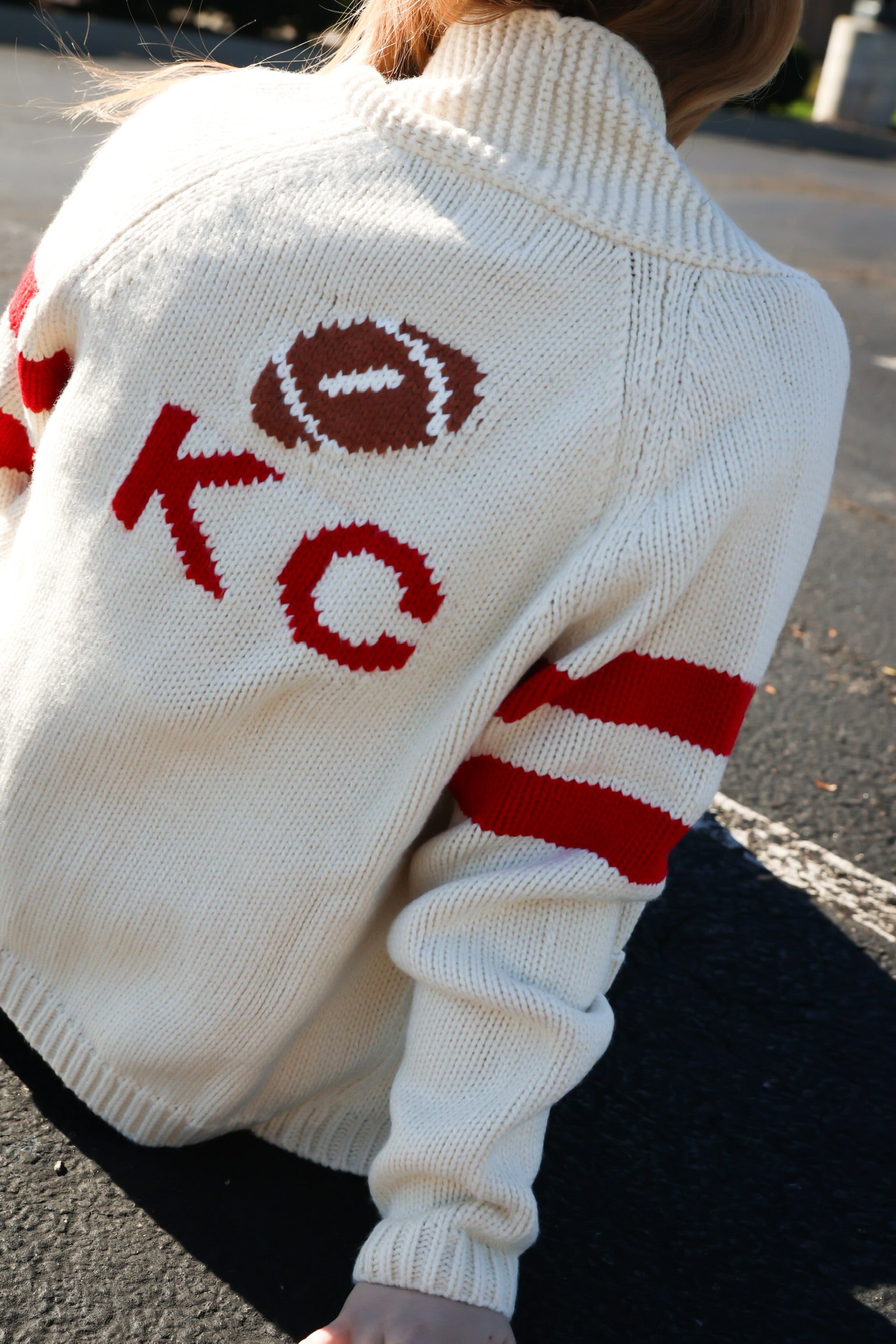Stay cozy and stylish this Fall with Clairvaux's exclusive KC Cardigan. Featuring an embroidered KC and football design, this cardigan is perfect for game day or everyday wear. With a convenient front pocket and foldover collar, this cardigan is both practical and fashionable. Don't miss out on this must-have piece for any football fan.