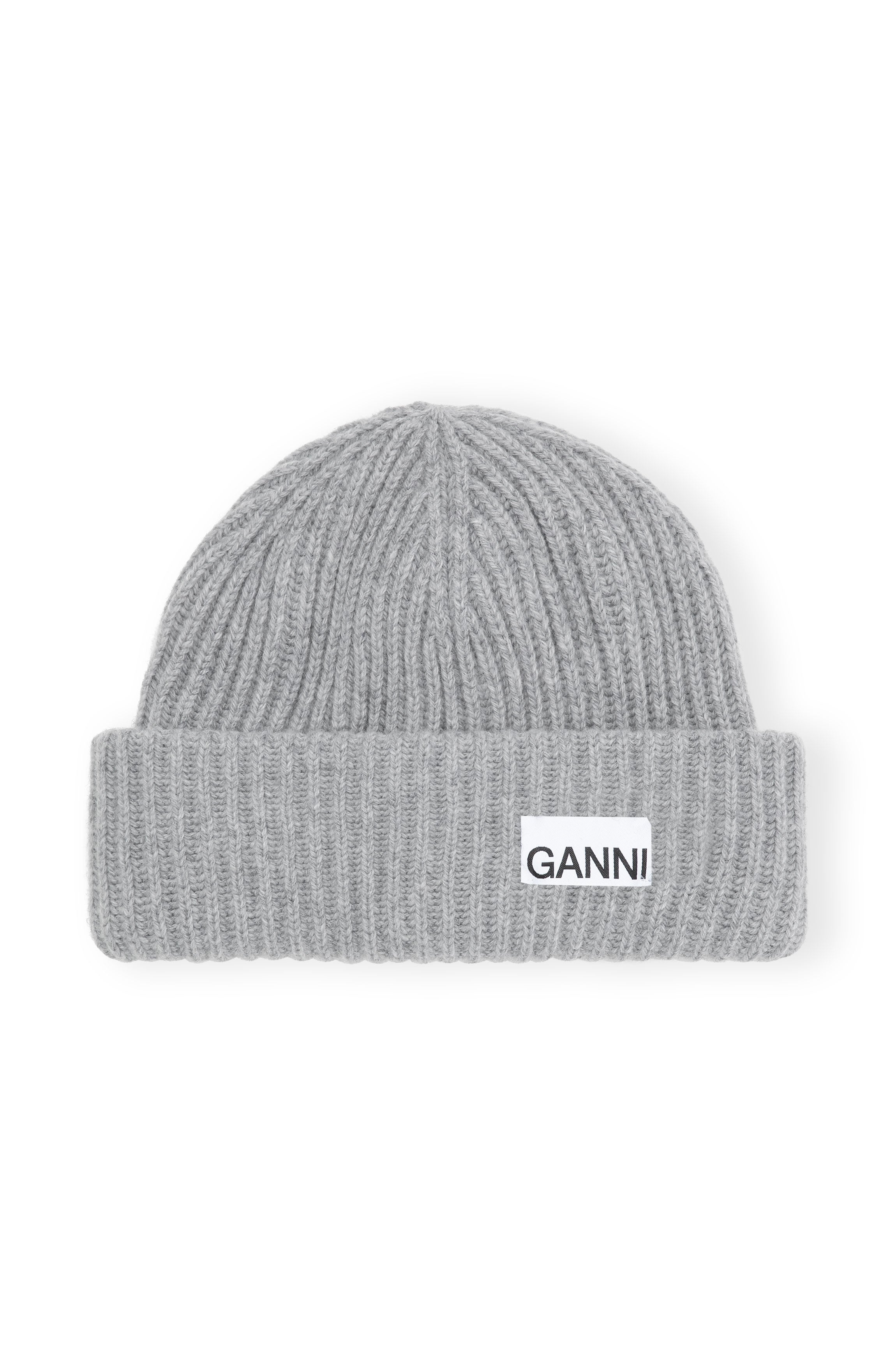 This Grey Fitted Wool Rib Knit Beanie is made from a blend of recycled wool and features a GANNI logo.