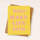 A vibrant "You Make Life Fun" card with bright pink text on a cheerful yellow background. This uplifting friendship card celebrates joy and positivity in a fun, colorful way.