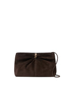 Clutch in brown gathered split suede. Features a multi-ring gold hardware accent, magnetic closure, lined interior, and a removable strap.
