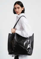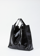 Experience ultimate convenience and style with the Jet Tote. Featuring a shoulder strap and handle straps, this boxy framed tote is not only functional but also adds a touch of shine to your everyday look. Say goodbye to carrying multiple bags and hello to effortless organization.