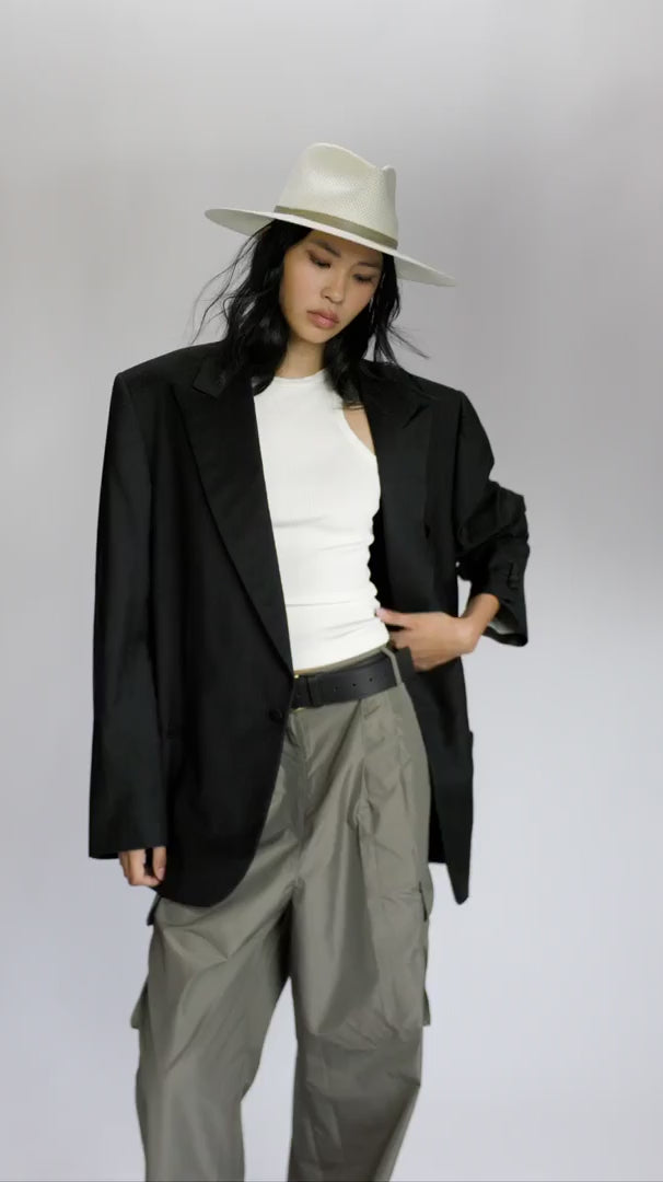 This packable straw fedora is finished with a sage, double-wrap regenerative leather band with open sides for an added airy element. The bleach-colored straw is complemented by a gold buckle closure. Ideal for sun-soaked days, Jude transitions seamlessly from day to night.