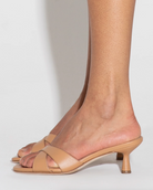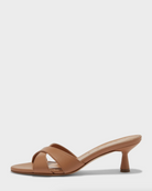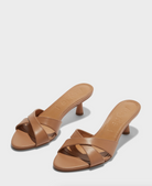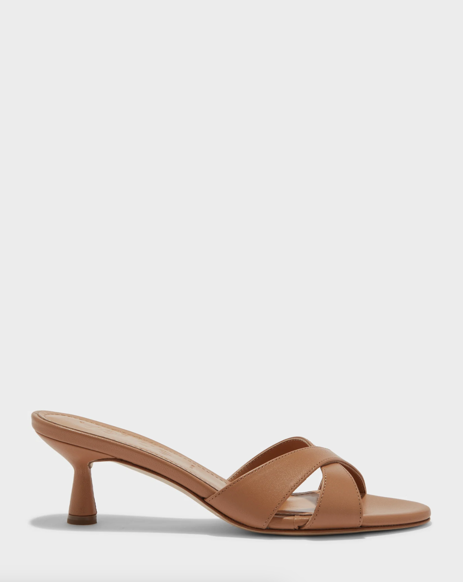 Vero is an elegant stiletto mule featuring interlaced nappa leather front straps, a round toe, and a signature hourglass heel.