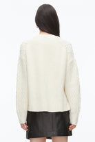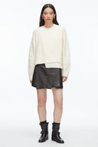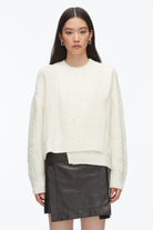 Classic with a twist. This crewneck cable sweater is knit from 100% extra fine merino wool, offering the perfect balance of warmth and breathability. A play of stitches—traditional cables and modern ribs—creates dimensional texture, while side slits and a stepped hem introduce ease and edge. Lightweight yet cozy, it’s a go-to knit that layers effortlessly from early fall through spring. Pair it with a leather mini or denim for feminine contrast.