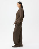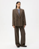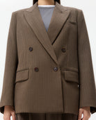 Oversized, double-breasted blazer in stretch wool. Fabric is viscose/wool blend with a touch of stretch for comfort. Tailored yet boxy fit with shoulder pads. Complete with peak lapels, buttons, chest welt pocket, and side pockets.
