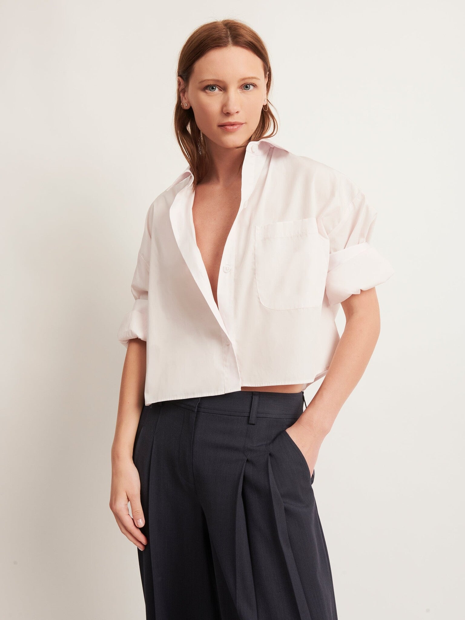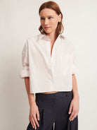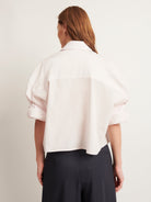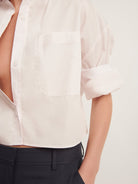 TWP’s signature short sleeved button down crafted in superfine Italian cotton shirting. The Next Ex is a cropped, boxy silhouette, complete with a chest patch pocket, button up placket, spread collar, and our signature double roll button cuffs.