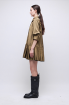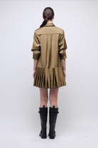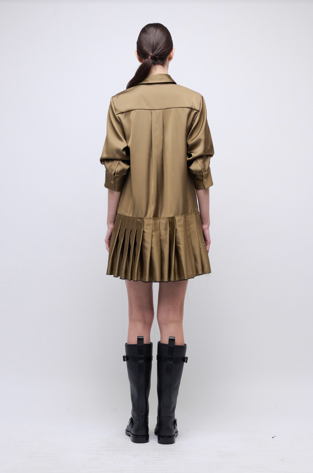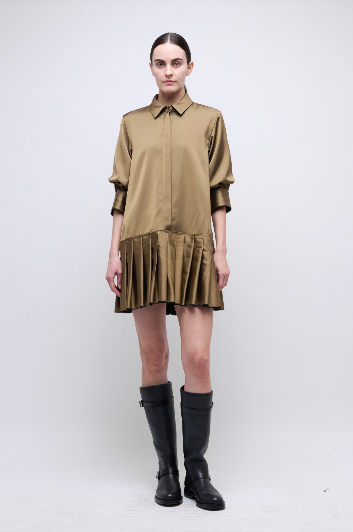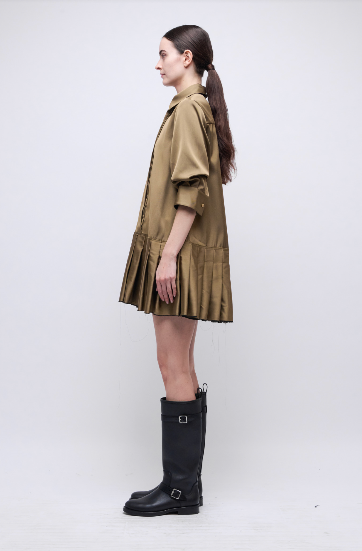 A mini shirt dress that combines a classic spread collar and hidden button front closure with an updated drop waist and pleated skirt in twill for structure.