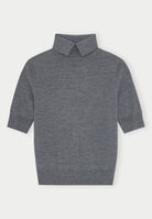 Introducing the Perry Knit Blouse: A knitted blouse featuring a high collar, with a length that extends to the waist.