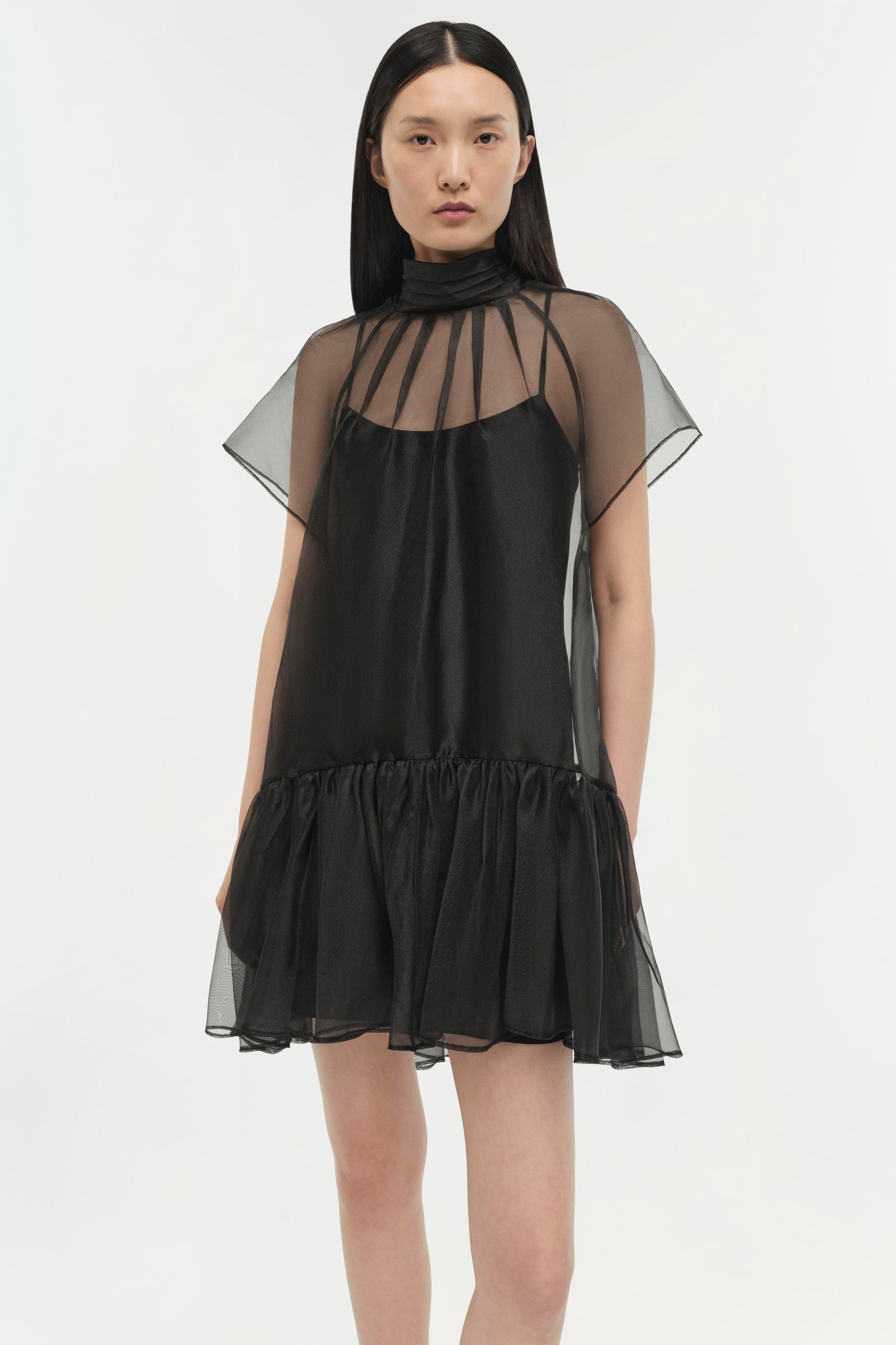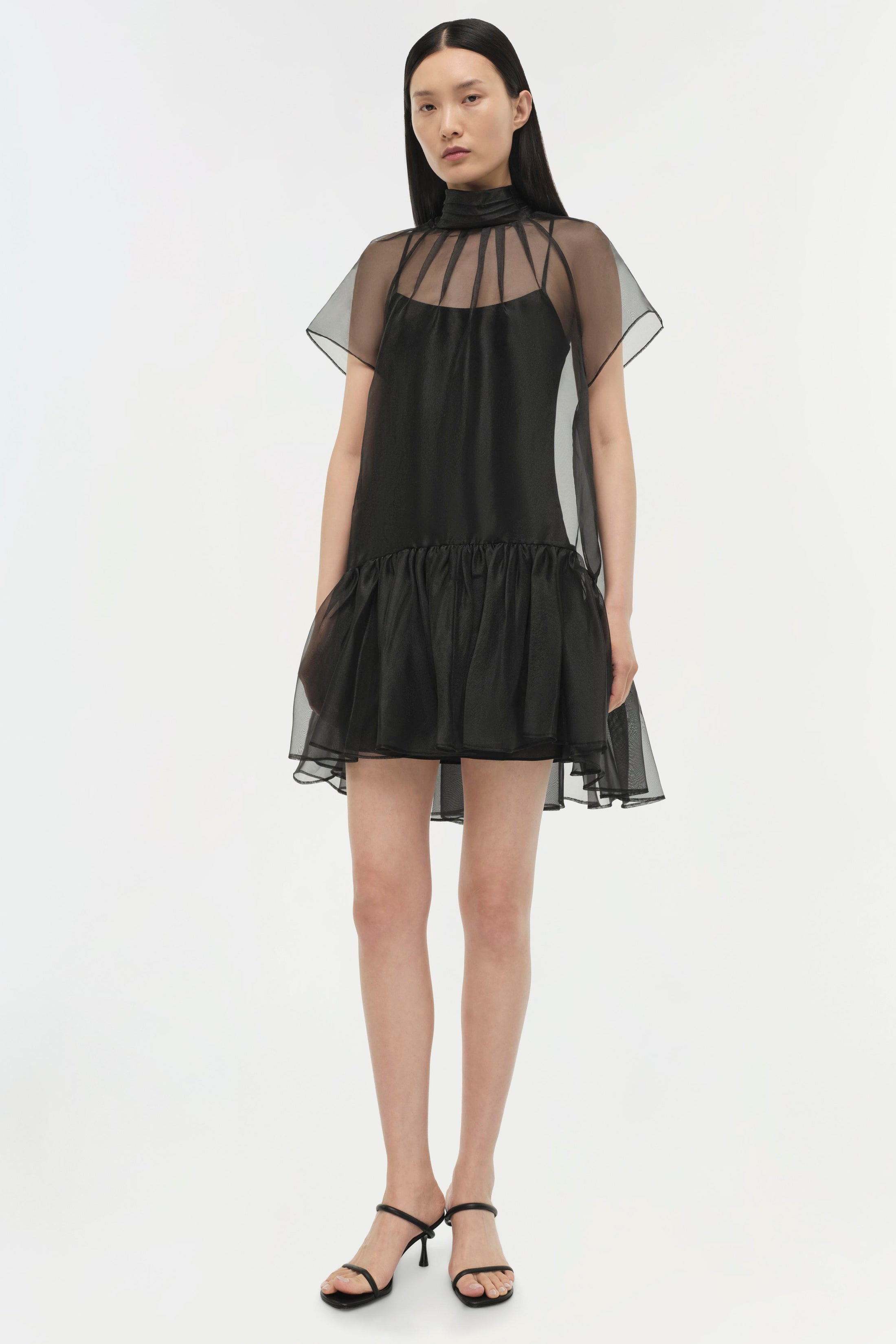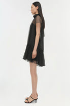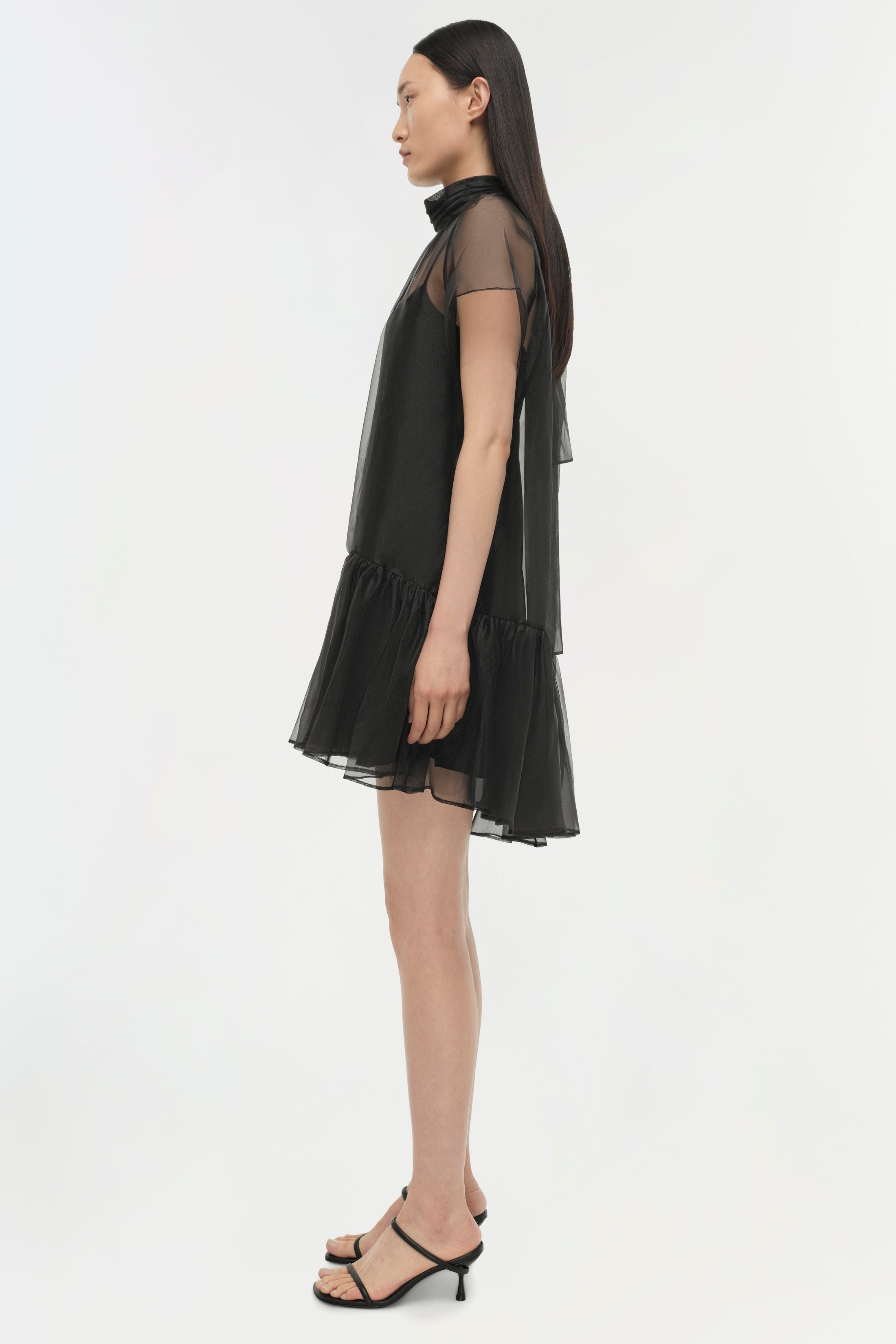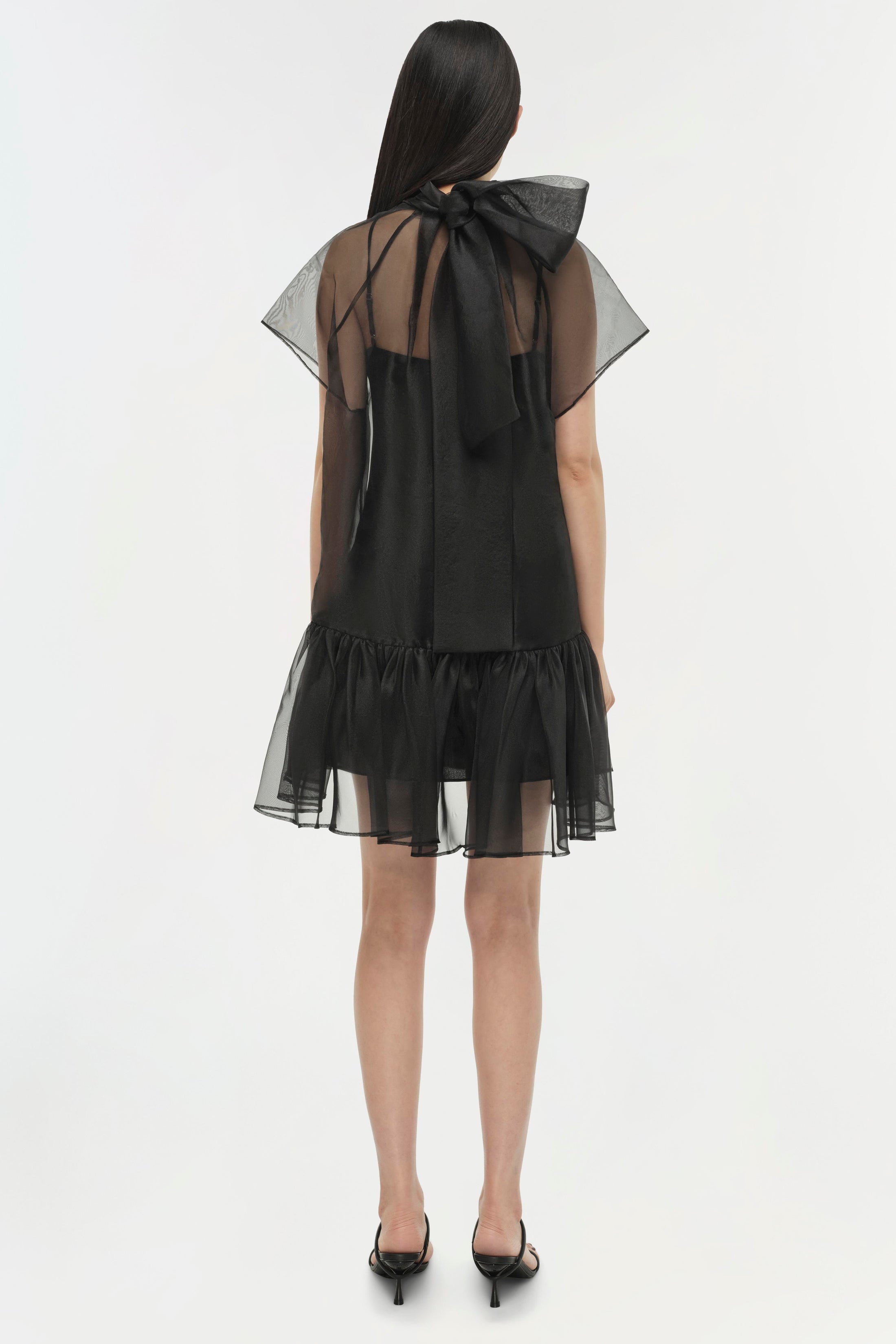 The Beaux Dress in Black. Showcasing delicate sheer layers and a charming high-neck tie detail, this tiered mini's flowy silhouette and ruffled hem add a playful, feminine touch to the design.