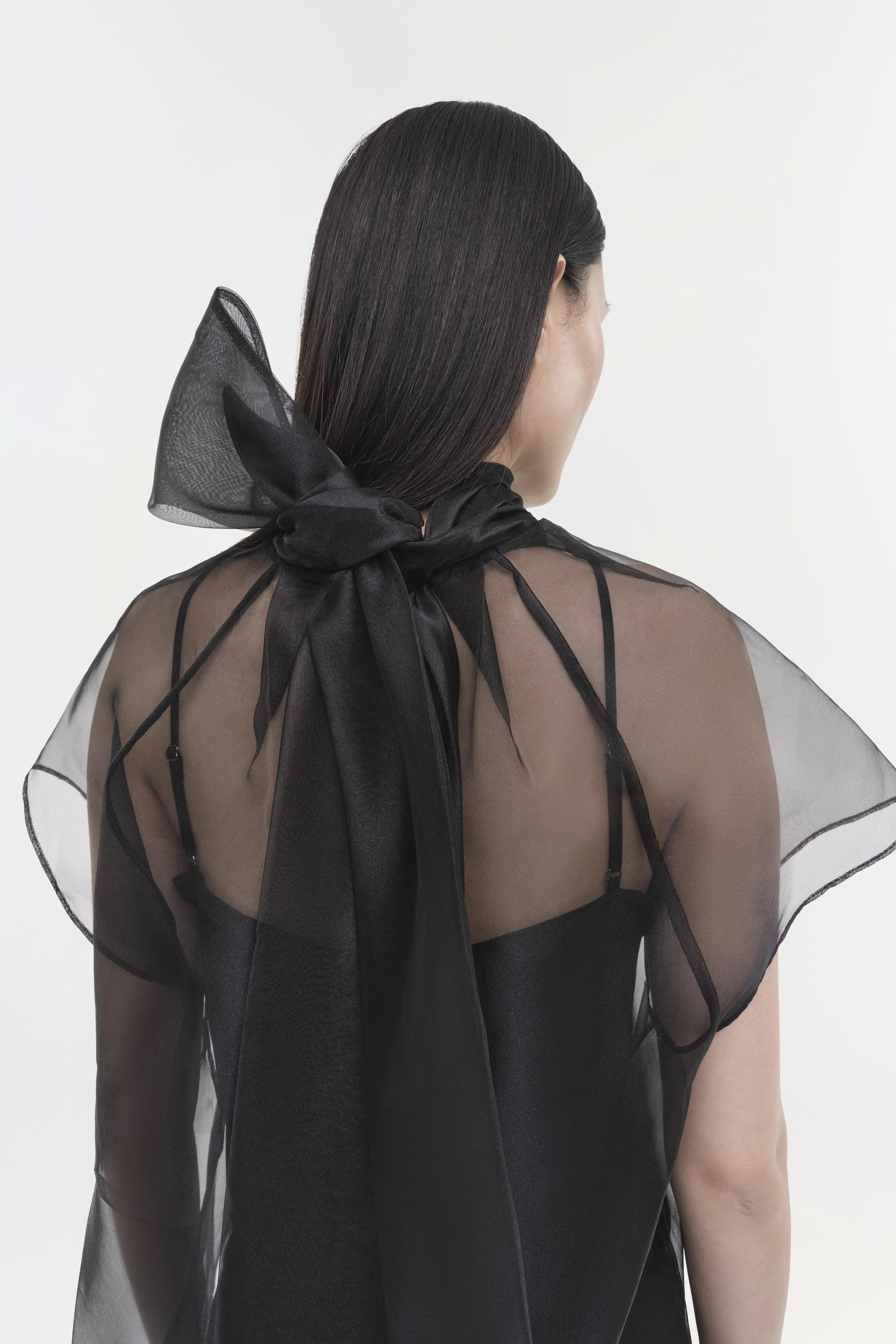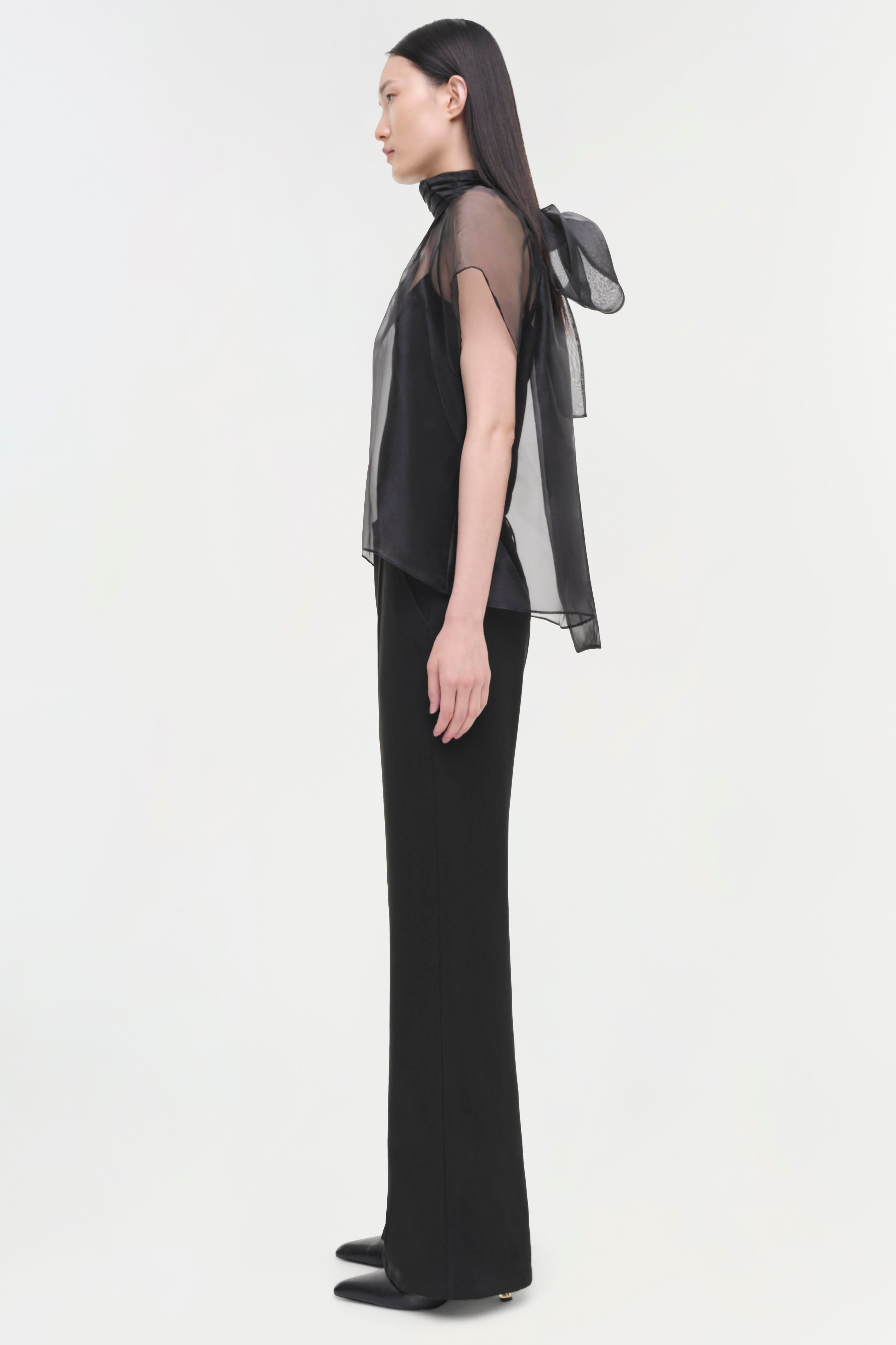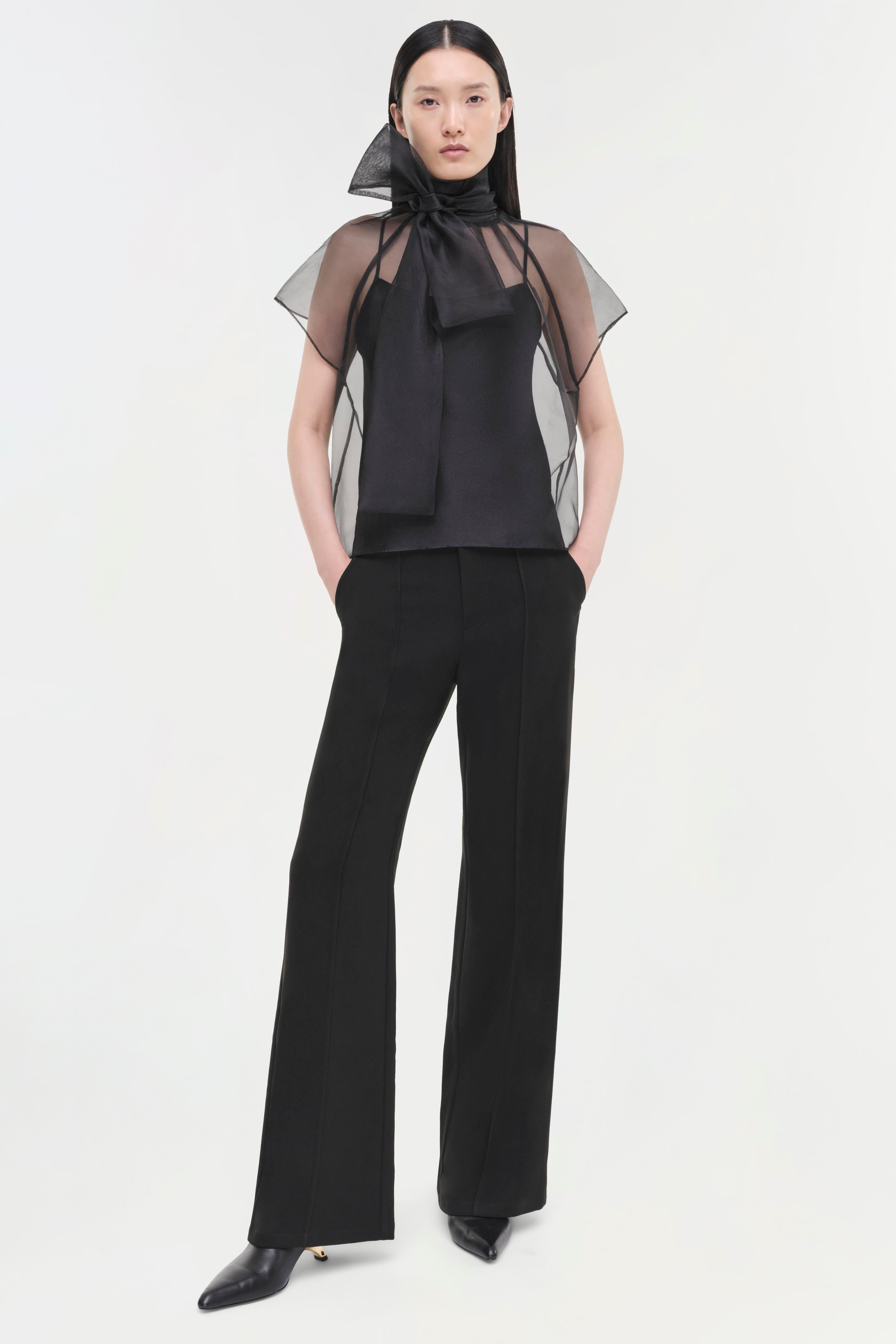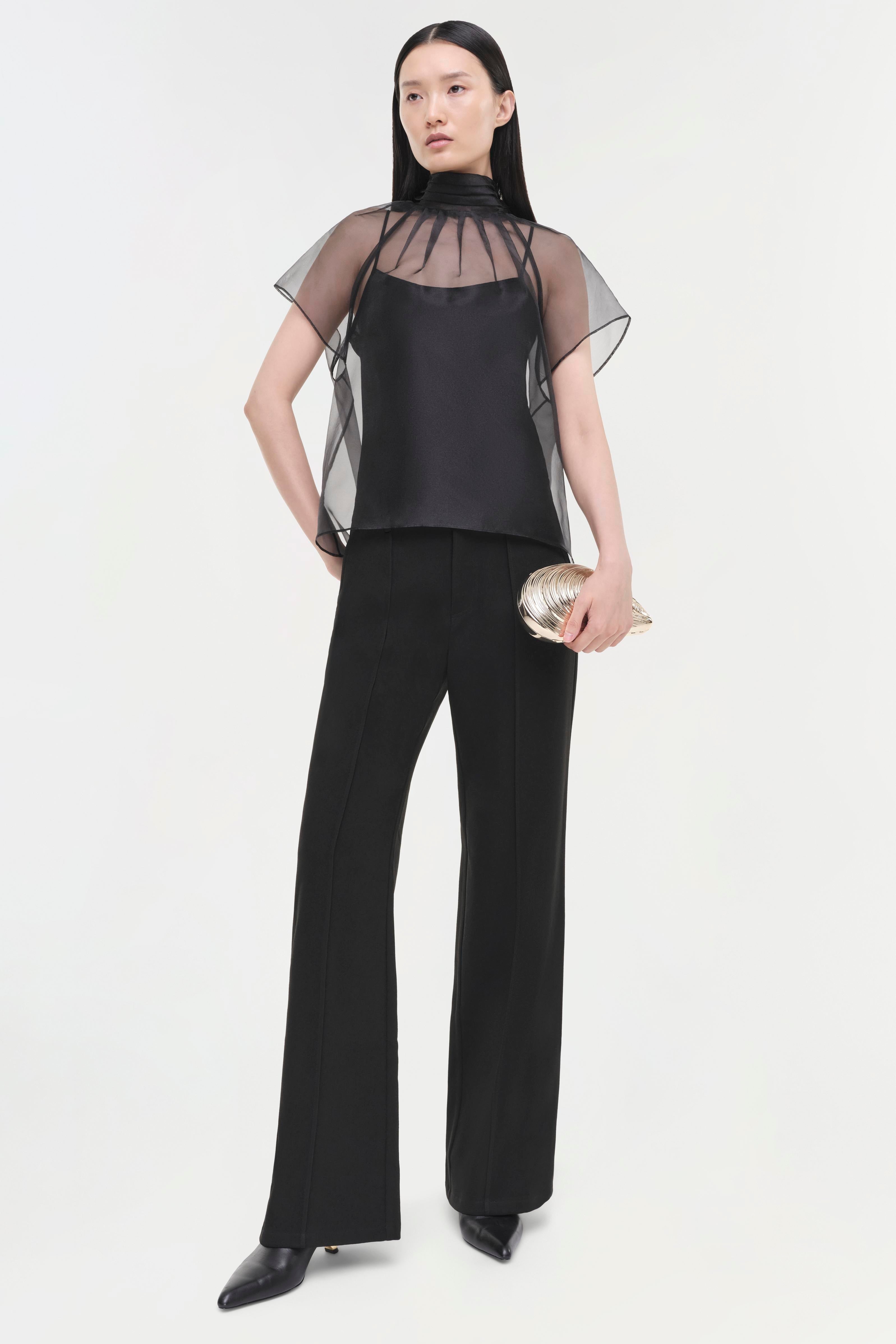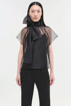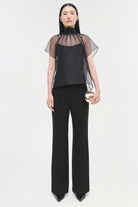 The Feyre Top in Black. This short-sleeve piece showcases a clean silhouette with a sheer overlay for added texture and visual interest.