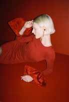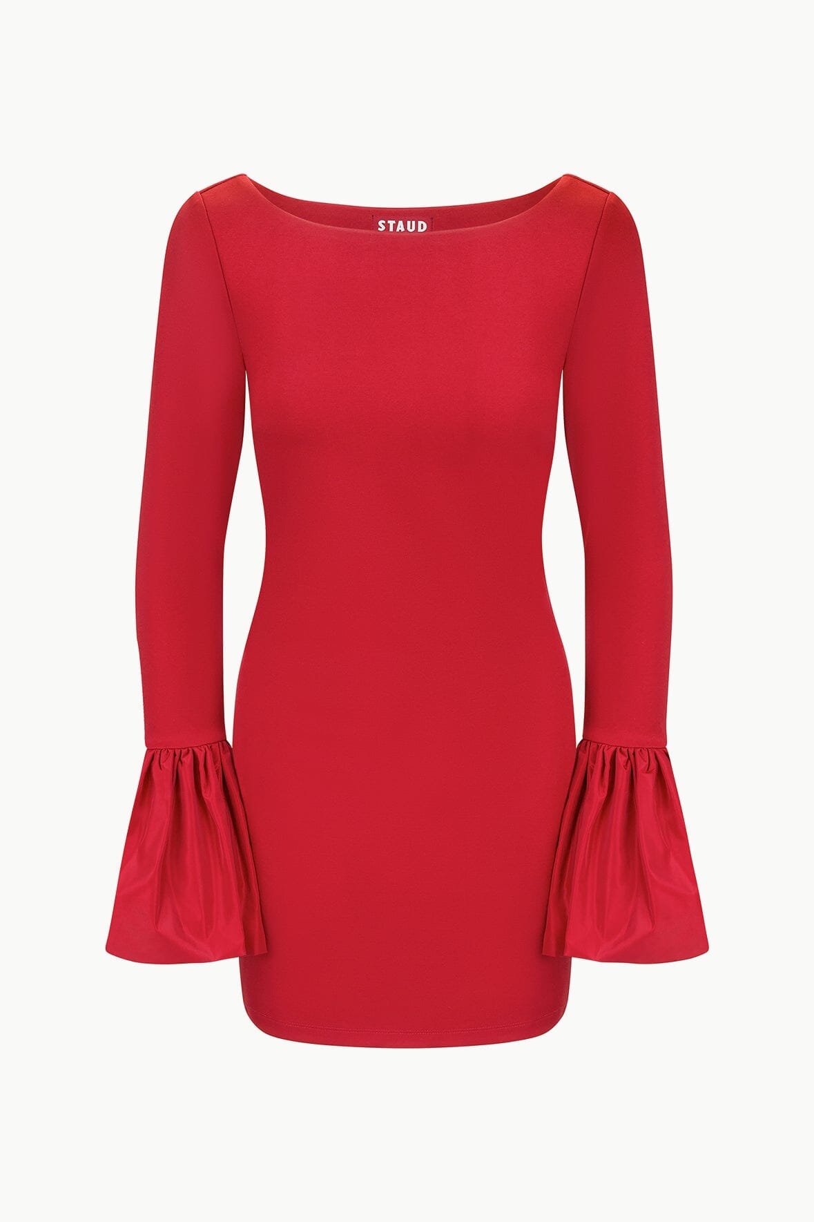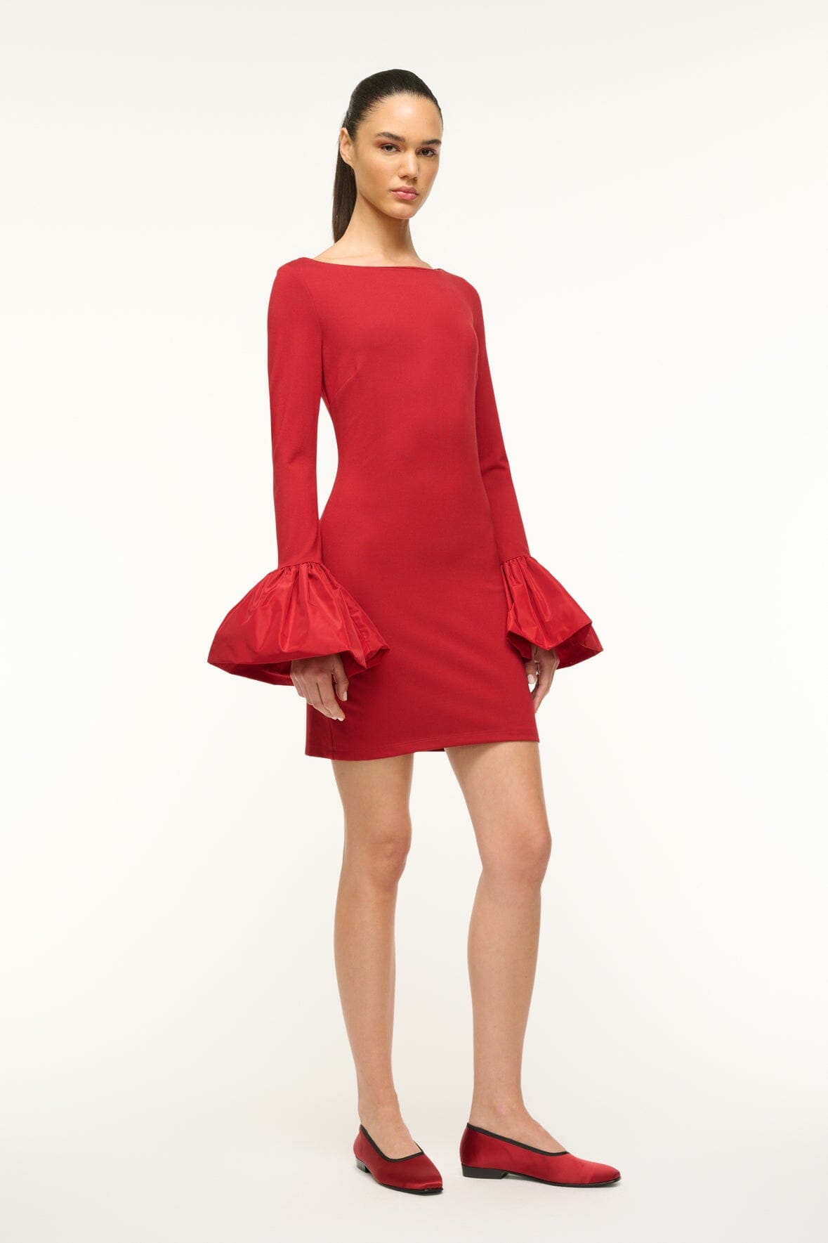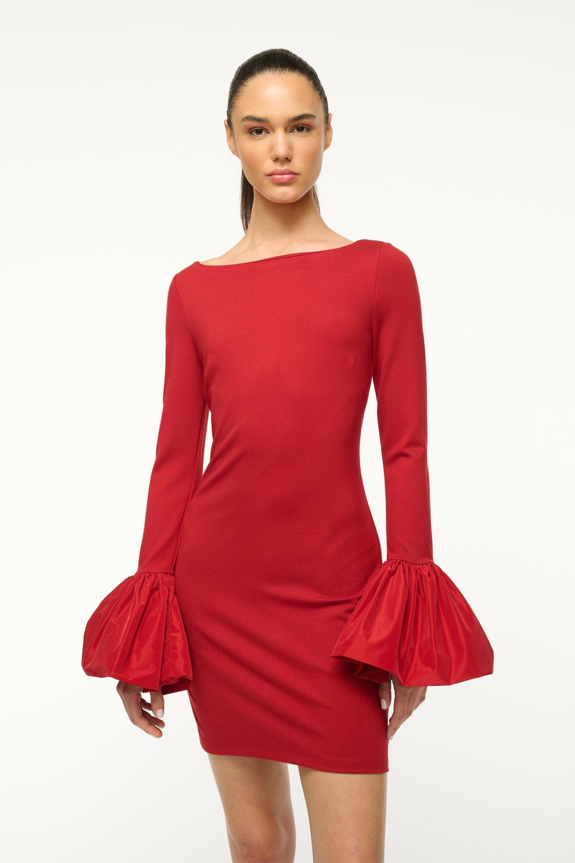 The Hawthorne Dress a cocktail dress made in our comfortable ponte fabric, featuring voluminous taffeta cuffs for a playful holiday look.