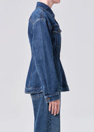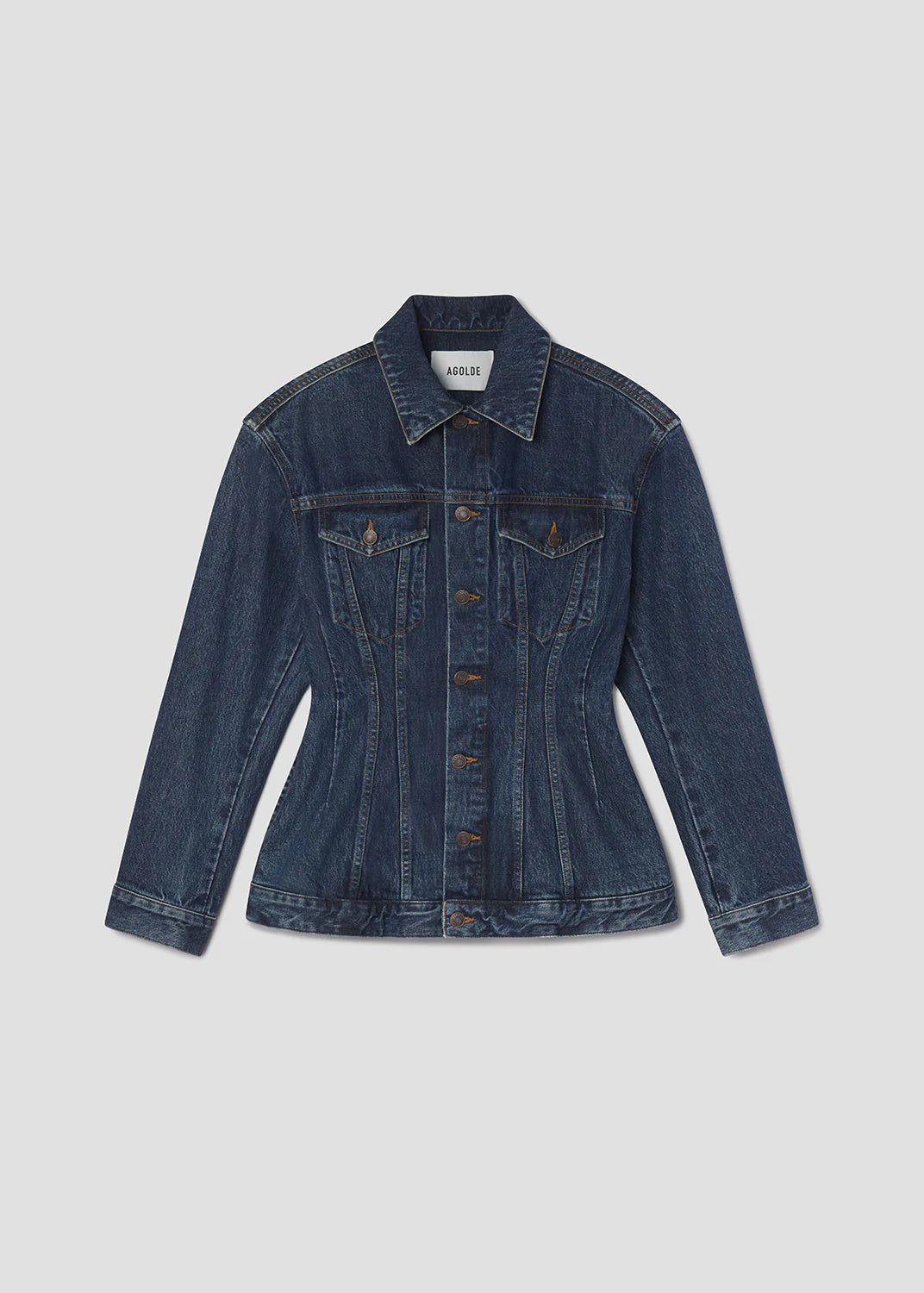 Looks Like: Dark worn indigo denim button front jacket with sculpted waist