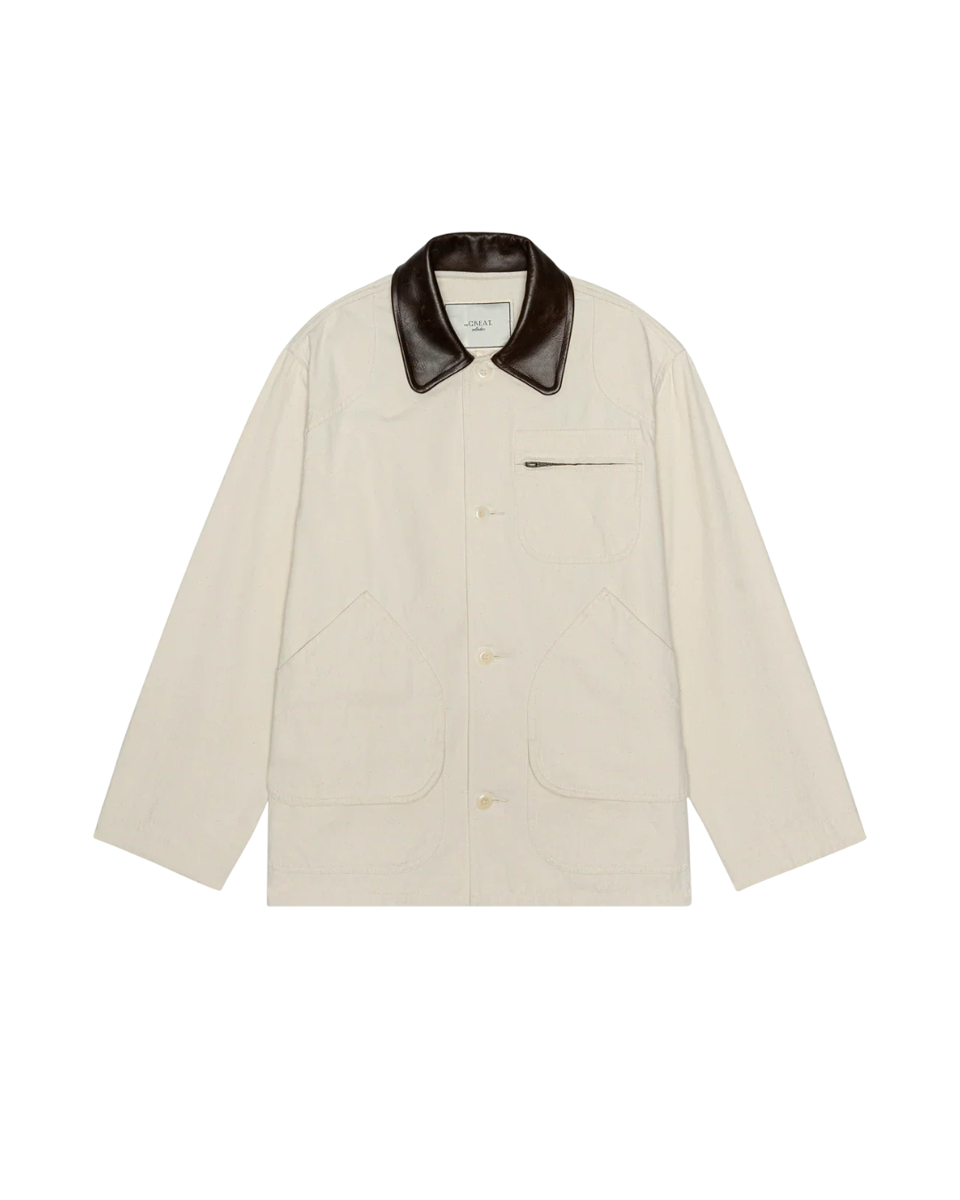 Our take on a heritage New England-style workwear jacket, designed with a relaxed fit. It features utility pockets, pleated vents at the back, and is made from garment-dyed cotton canvas. The contrast collar is crafted from genuine leather, and the jacket is finished with corozo buttons at the front placket and cuffs.