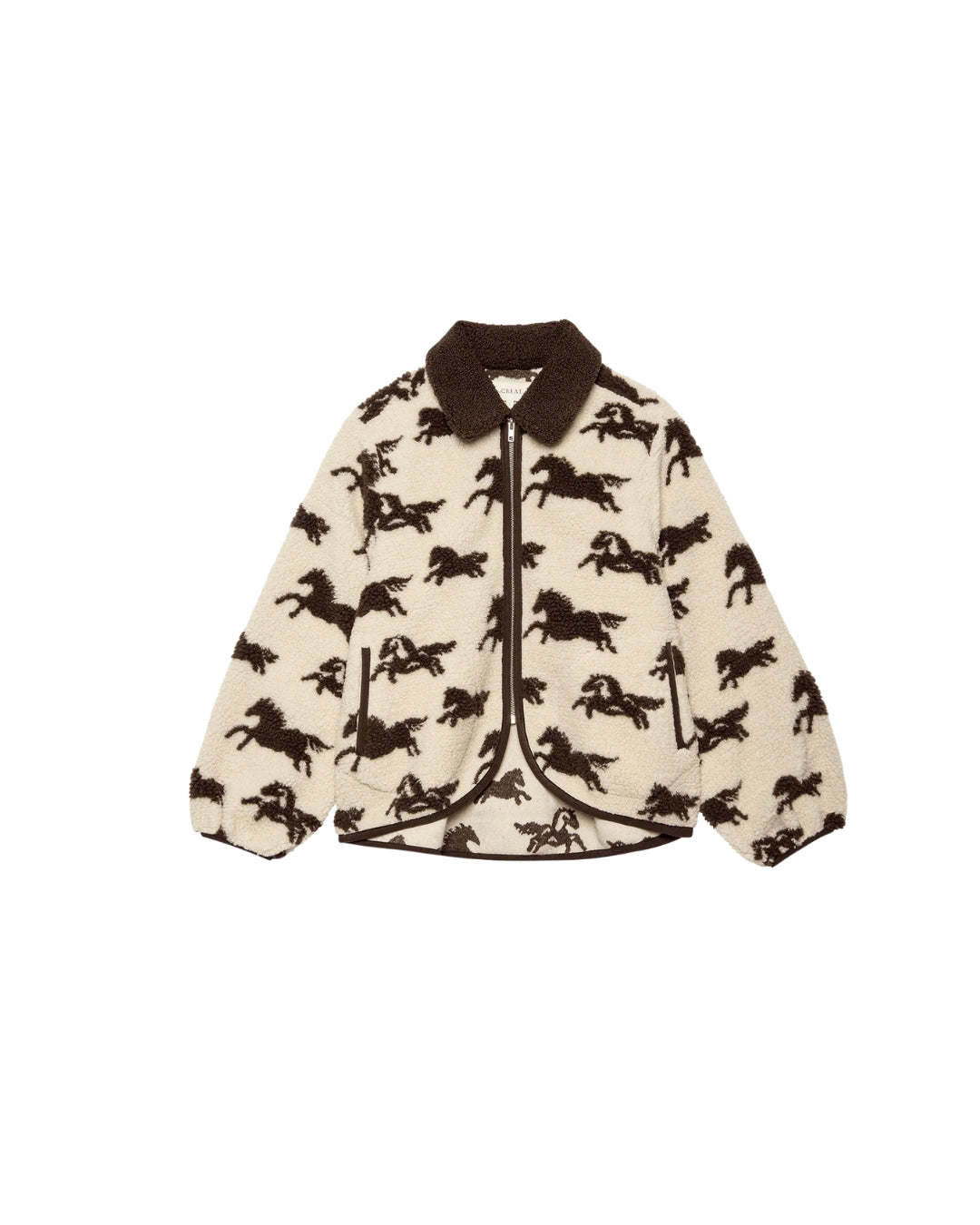 The Pasture Jacket. is ready for outdoor adventures. The relaxed zip-up jacket is crafted from a plush fabric and tells the story of wild horses running across a meadow. Distinguishing characteristics include a charming shirttail hemline, contrast stretch binding around the edges, a fluffy plush collar, billowy sleeves, and welt pockets in an earthy brown that pairs with everything in your closet.