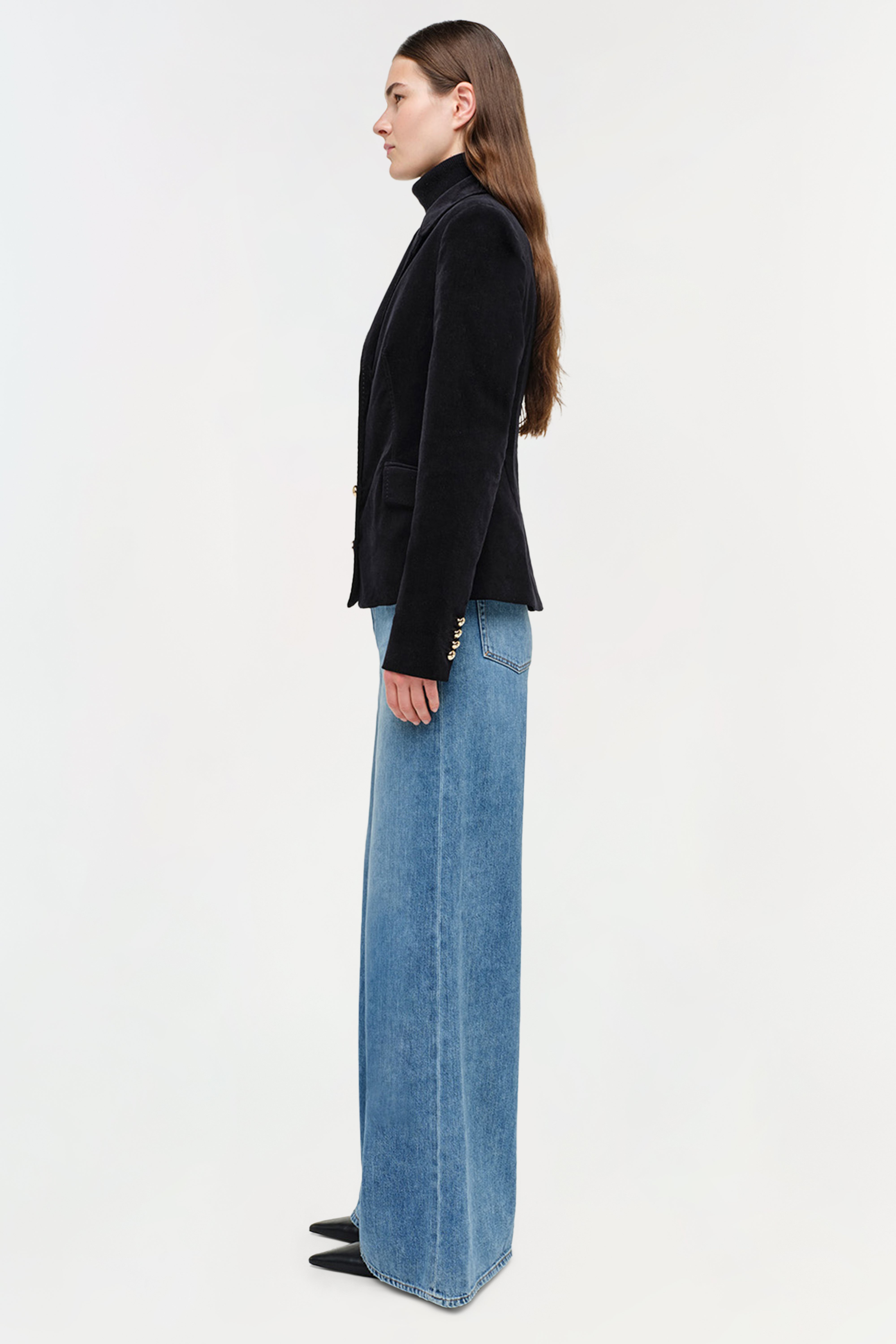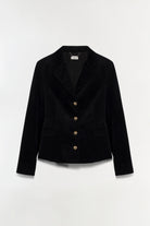 Tailored from plush velvet, this blazer is cut with sharp lines that sculpt a defined silhouette. The rich texture is balanced by gleaming golden buttons, offering a sleek contrast. A timeless layer, it merges luxury texture with polished tailoring.