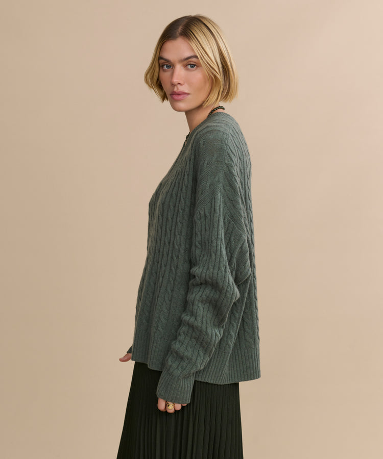 Jenni Kayne's take on the classic cable knit sweater with a relaxed fit and v-neck twist. With a slouchy body and elevated feel, this sweater will be your new go-to. Pair it with trousers, denim, or even a skirt for all-season appeal.