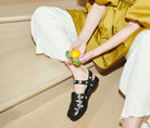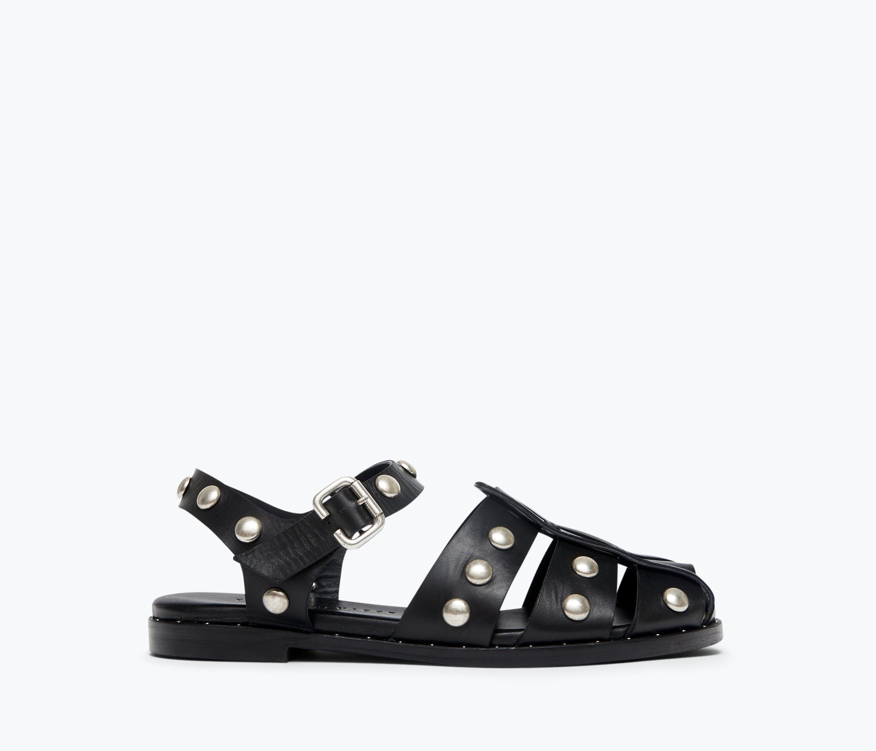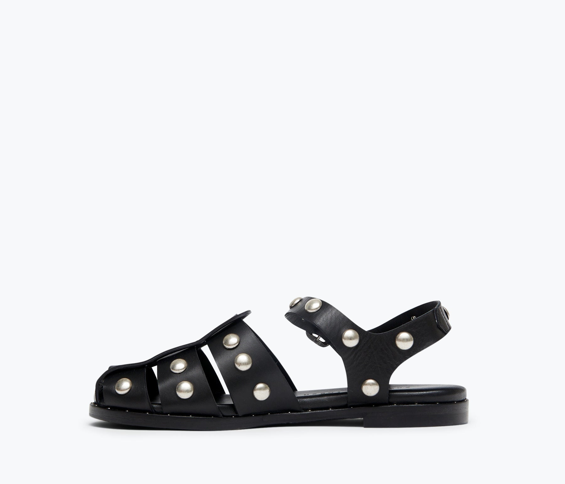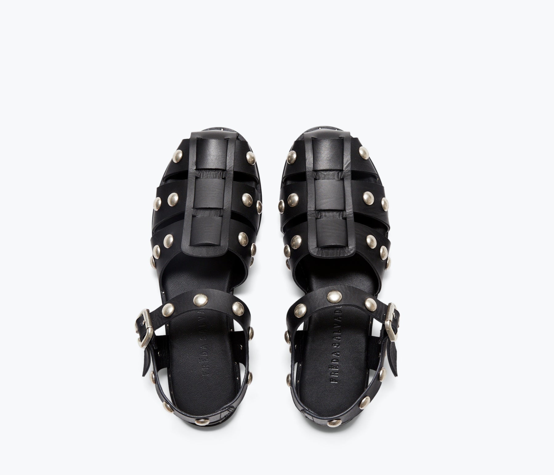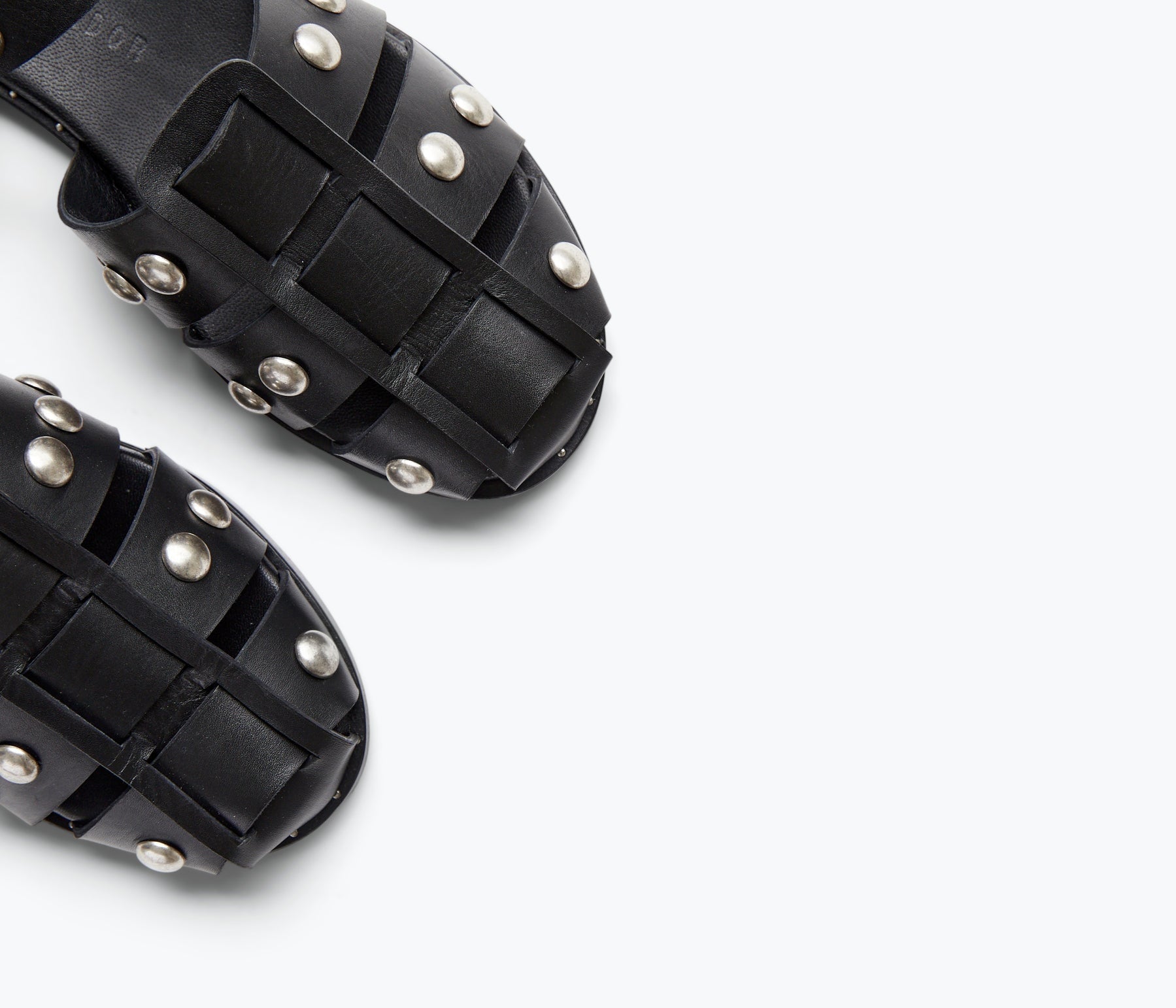 A tougher fisherman sandal. Handcrafted with our signature black calf, the SERA is classic with the caged upper and padded footbed but reimagined this season with cool understated studs.
